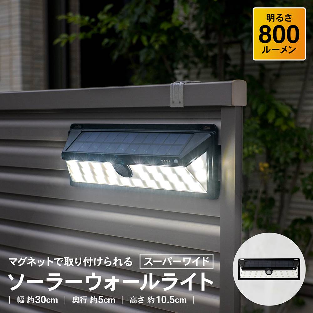 【特長】●マグネットで取り付けられる●シーンに合わせて3種類のモード切替可能!!●広範囲を明るく照らす!!●防雨構造●配線不要●ソーラー充電式●夜間点灯●探知エリア:最大約110° 最長約5m【モード切替】●モード1:暗くなると人を探知し、高輝度で約15秒間点灯した後、自動で消灯します。●モード2:暗くなると低輝度で点灯し、人を探知すると高輝度で約15秒間点灯した後、自動で低輝度の切り替わり点灯し続けます。●モード3:暗くなると低輝度で常時点灯します。●OFF:消灯します。※充電する場合、または使用しない時はOFFにしてください。【仕様】●光の色:ホワイト●光源:LED×30個●使用電源:リチウムイオン充電池2000mAh(電池交換不可)●点灯回数(高輝度時):約450回(満充電時)●ルーメン値:約800ルーメン(LED×30個)●探知方式:赤外線探知方式●点灯時間設定:約15秒●設置場所:屋外(防雨構造 IPX5)●サイズ:幅300×奥行50×高さ105mm●重量:425g●付属品:壁取り付け用ネジ2個、壁取り付け用スリープ2個【注意!】●取り付け位置は地面から2.5m付近を推薦しております。取り付け位置の高低により、探知エリアが狭まる可能性があります。●振動や風の影響を受けるものなどが探知エリアにある場合、センサーが誤作動を起こす場合があります。●探知エリアは目安です。環境条件(季節、気候、温度、湿度)により異なります。●ご購入時は充電が不十分です。探知センサー内部が赤く点滅したり、周囲が暗くなっても点灯しないときは電源をOFFの状態で晴天の日に夏期は2〜3日、冬期は5〜6日充電してください。※仕様及びカラーは予告無く変更する場合がありますのでご了承ください。●ラベル記載の写真・イラストはイメージです。oソーラーライト oウォールライト