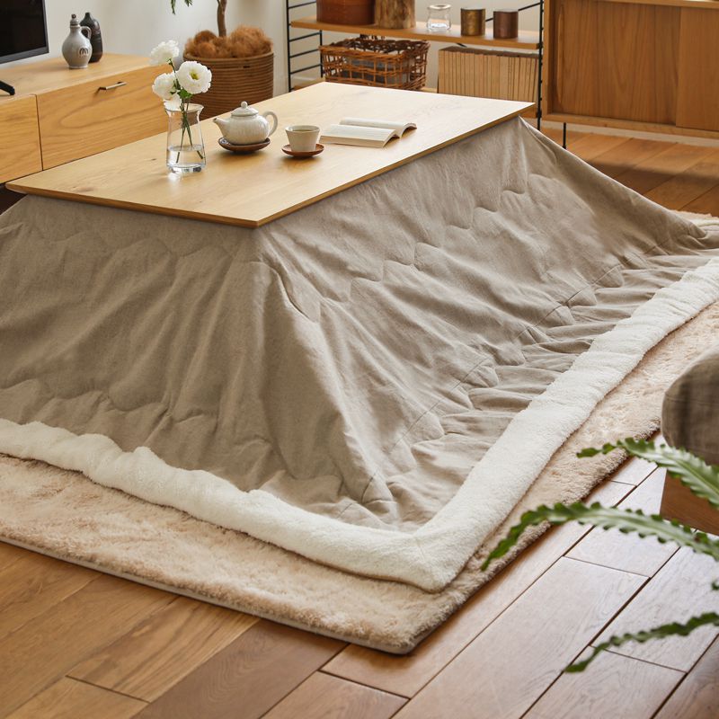SPECスペック サイズ 190cm × 190cm布団厚み:ボア部分 約 3cm、その他 約 2cm梱包サイズ:幅 50cm × 奥行き 43cm × 高さ 22cm カラー ナチュラル 素材 表面:コットン、リネン裏面:ポリエステル 備考 重量:約 3kg梱包重量:約 3.5kgドライクリーニング可(水洗い・洗濯機不可)テーブルは別売りです。テーブルは、こたつテーブルラインアップをご覧ください。 こちらの商品は、サイズ展開がございます。下記リンクより、他サイズのページをご覧いただけます。 正方形 190cm×190cmは現在のページです。 長方形 230cm×190cmはこちら カテゴリー:こたつ布団/即日出荷可能アイテムナチュラルヴィンテージにやさしく馴染む。天然素材の薄掛けこたつ布団お部屋の大きな面積を占めるこたつ布団。空間の印象を左右するアイテムなので、選ぶものによっては、なんだか野暮ったくなってしまう心配もありますよね。だからこそ「こだわったものを選びたい!」という方も多いのではないでしょうか。「LIM(リム)」は、リセノのナチュラルヴィンテージの世界観に合うように製作した別注プロダクト。リネンとコットンの温もりある風合いが魅力の薄掛けこたつ布団です。一般的に化学繊維が用いられることの多いこたつ布団ですが、ふんだんに天然素材を使用することで、ぐっと上質な印象に。落ち着いたアースカラーは悪目立ちせず、空間にやさしく馴染むので、木製家具やインテリア雑貨の風合いを引き立ててくれるのも魅力のひとつ。大きな面積を占めるものだからこそ、こたつ布団を変えるだけで、お部屋全体を味わい深くワンランク上の雰囲気に仕上げることができるんです。ざっくりと味わいのあるリネンの質感。何度も製品化を試みて、ようやく完成しました。使用しているリネン素材は、太い番手のもの。実は、アパレル用の細いリネンは豊富にあるのですが、太いリネンは市場にあまり出回っていないので、希少ともいえるんです。ただ、細いリネンだと、ナチュラルヴィンテージに合わせると少し上品すぎる印象に。納得のいくものが見つからず、何度も製品化を見送りました。そうして、数年探し回って、ようやく見つけたのが今回使用しているリネン。ざっくりとラフな風合いと質感。程よくこなれた雰囲気で、ナチュラルヴィンテージテイストにぴったりなこたつ布団に仕上げることができました。また、この太いリネンがこたつ布団に使われることも、ごくごく稀なこと。というのも、太い糸で紡績された生地は、変形しやすかったり布団が透けやすかったりするというリスクがあるからです。そこで、LIMは生地の裏面にもう1枚「芯地」という生地を重ねて、そういったリスクを防止する加工を施して生産しています。すぐに買い替えるようなものではないからこそ、見た目だけでなく、細部までにこだわって、ようやく完成したこたつ布団。ナチュラルヴィンテージなお部屋に合わせて、長くお使いいただければと思います。保温性に優れた「リネン×コットン」。裏面は、ふんわり気持ちよいボアを使用しています。LIMの表面には、天然素材のリネンとコットンを合わせた生地を採用。「リネン」と聞くと、夏のイメージが強いという方も多いかもしれませんが、実は保温性にも優れた素材。繊維の中の空洞部分に空気を含むので、寒い冬は体温で温まった空気を逃しません。コットンも同様の性質を持っているので、冬でも快適にお過ごしいただけます。また、肌触りは柔らかいというよりも、すこし硬めの感触。「硬め」というと、使い心地が気になるかもしれませんが、肌に当たる裏地部分には、やわらかく優しい肌触りのボアを採用。保温性にも優れているので、寒い外気をしっかりと遮断してくれます。軽くて薄いのに、暖気は逃さずキープ。体にフィットする薄掛けタイプ「薄掛けタイプは寒いのではないか?」と心配する方がいるかもしれませんが、布団がテーブルに沿うようにして裾の広がりを抑えてくれるので、身体にぴったりフィット。布団を掛けた時に重さを感じず、横になってくつろぐ時も快適に過ごすことができます。一般的な厚掛けタイプの布団に比べて、こたつを置いてもすっきり広々とした印象に。軽くて圧迫しないデザインなので、ワンルームでも動線を邪魔しません。また、薄掛けタイプのメリットは収納時にも。クローゼットや押し入れのスペースを何かと圧迫する季節物のアイテムですが、畳んだときもコンパクトなので、省スペースで片付けることができます。ちなみに、シーズン終わりに気になる「布団のお手入れ」について。手洗いはできませんが、ドライクリーニングであれば可能。クリーニング専門店で洗ってもらい、圧縮袋などに入れておけば、収納にも場所を取らないのでおすすめです。テーブルのタイプに合わせて選べる2サイズ展開サイズは190cm×190cmと230cm×190cmの2サイズをご用意いたしました。こたつテーブルに対しての、適正なこたつ布団サイズは、テーブルサイズ+110〜130c