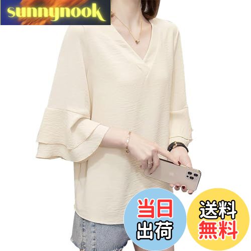【送料無料】[7-livehouse] シャツ レディース 七分袖 ブラウス シフォン トップス フレアスリーブ vネック 無地 Tシャツ 二の腕カバー 薄手 ゆったり 体型カバー フリル袖 大きいサイズ きれいめ 通勤 春 夏