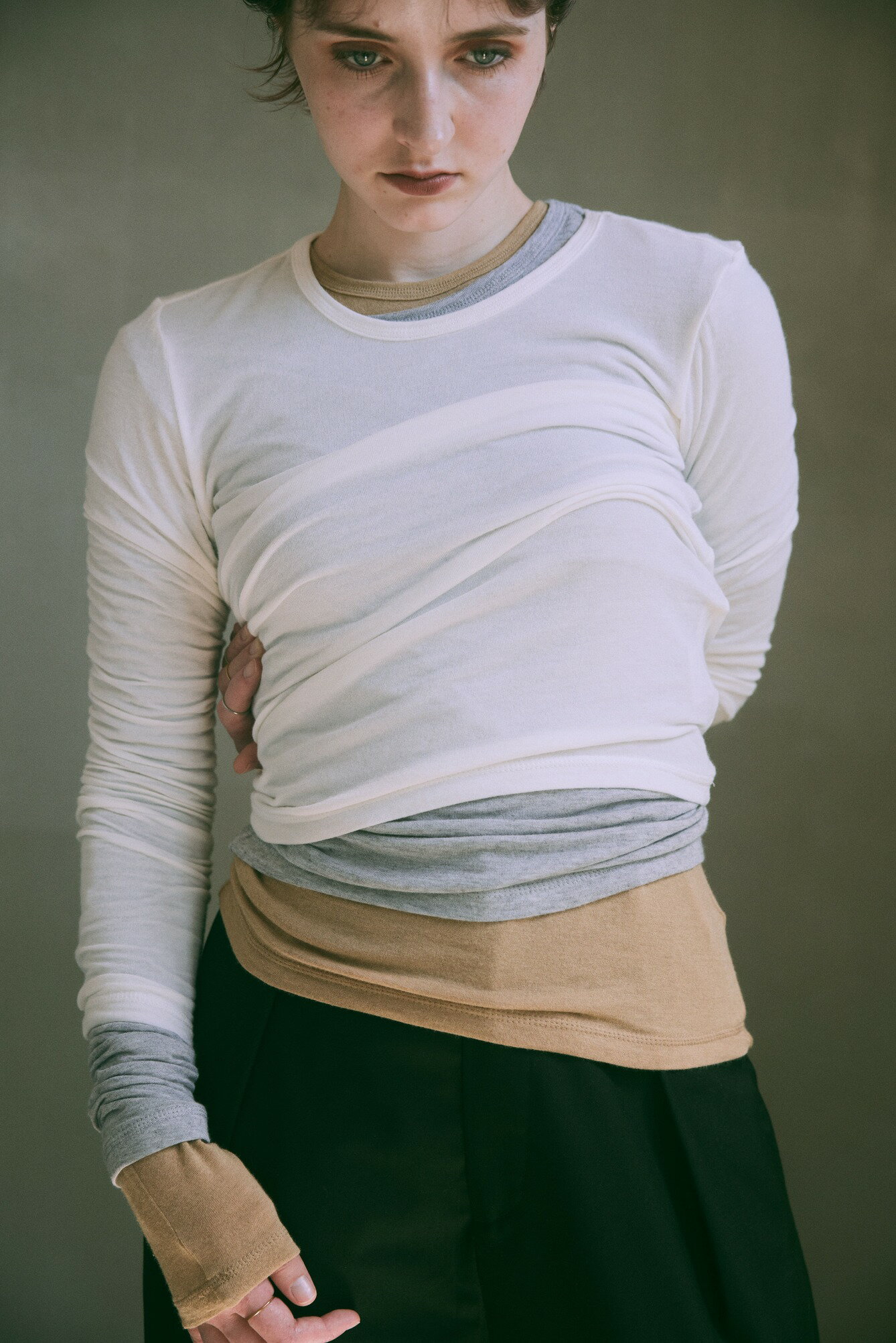 ソフトで肌触りの良い国内生地を使用したトップス。 袖丈は長めに設定しているので、手首で溜まるのがポイント。 お好みの組み合わせで、レイヤードでの着用がおすすめです◎ 一枚ではもちろん、インナー使いもしやすいアイテムです。 ※1〜2cm程度の誤差が生じる場合がございます。予めご了承下さい。 ※屋外の光や照明の当たり具合で、実際の商品の色味と画像の色味に若干の違いが発生する場合がございます。 【素材】ビスコース82% ウール9% ポリウレタン9% 【SIZE】one 着丈 60cm 肩幅 35cm バスト 76cm 袖丈 71cm 裾幅 38cm 【生産国】日本