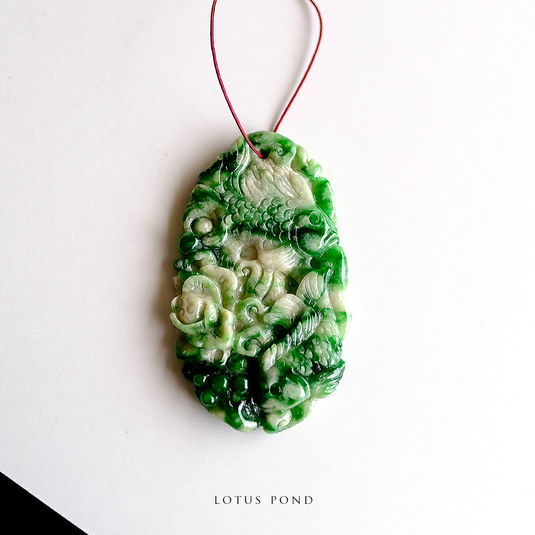 翡翠 (ひすい) 彫刻 ペンダントトップ『LOTUS POND』アイシーグリーン翡翠 鯉 花 如意 一点物 無着色 高品質 ジェダイト ミャンマー産 天然石 硬玉 ナチュラル お守り パワーストーン 国石 5月誕生石 ギフト プレゼント 【送料無料】