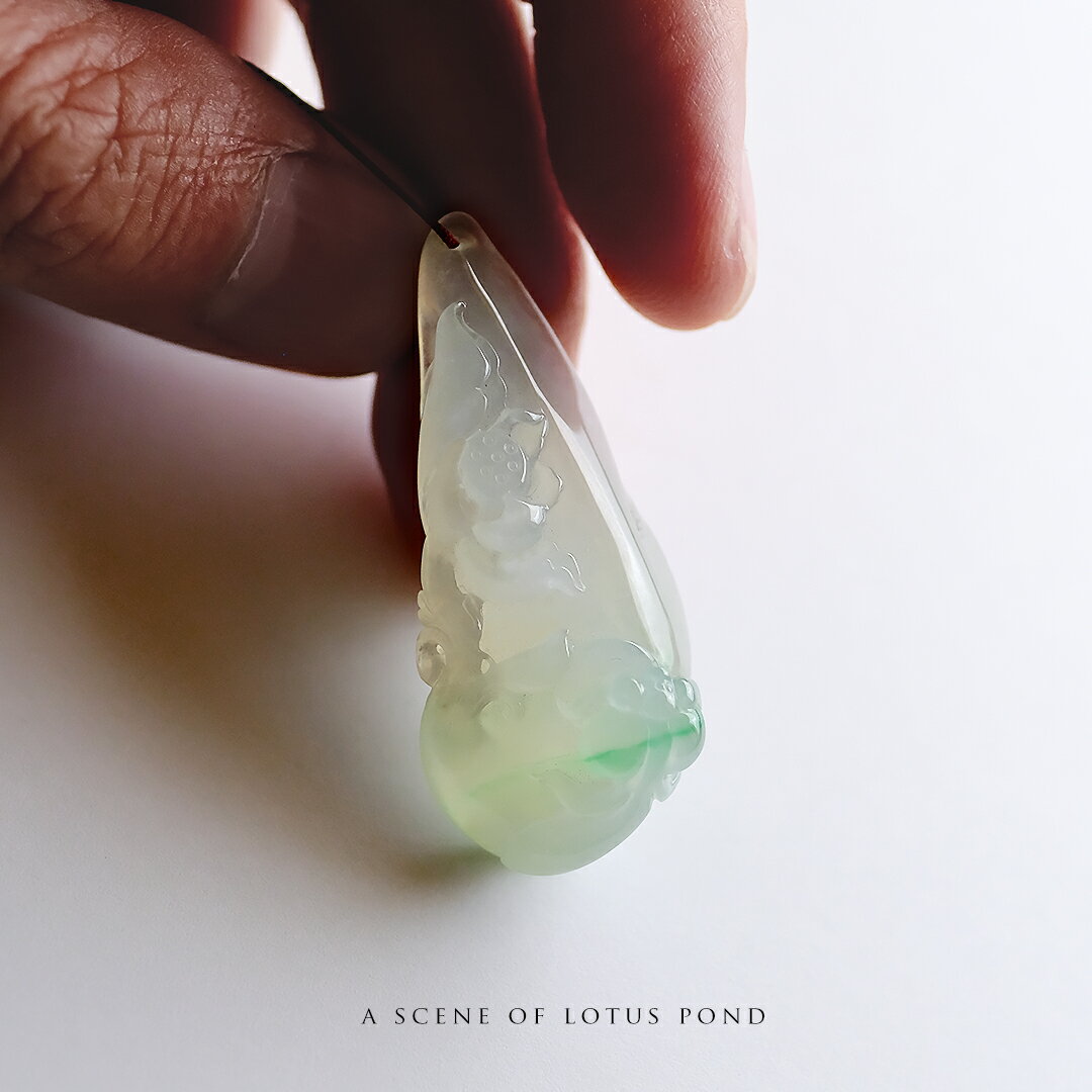 翡翠 (ヒスイ) 彫刻 ペンダントトップ『A SCENE OF LOTUS POND』アイシーグリーン&アイシーホワイト翡翠 蓮 ミャンマー産天然ひすい 一点物 国石 高品質 無着色 ナチュラル 硬玉 ジェダイト プレゼント お守り パワーストーン 5月誕生石【鑑別書作成無料】【送料無料】