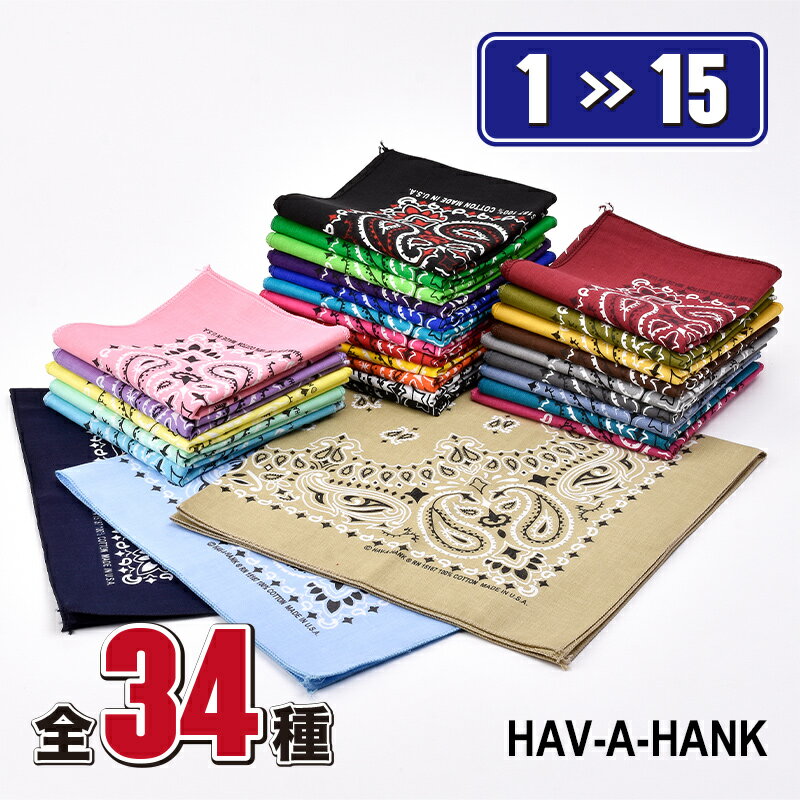 メーカー名HAV-A-HANK(ハバハンク) 品名TRADITIONAL PAISLEYS BANDANA(トラディシナル ペイズリー バンダナ) 素材綿100% ※一部の柄でポリエステルを使用 サイズ約55cm×55cm ※若干の個体差があります カラー 1.Beige ベージュ 2.Black×Red ブラック×レッド 3.Black ブラック 4.Blue×Red ブルー×レッド 5.Burgundy バーガンディ 6.Chambray Blue シャンブレーブルー 7.Charcoal チャコール 8.Cocoa ココア 9.Fuschia フクシア 10.Gold ゴールド 11.Honeysuckle ハニーサックル 12.Hot Pink ホットピンク 13.Hunter Green ハンターグリーン 14.Kelly ケリー 15.Lavender ラベンダー ●ご使用のブラウザによっては色の見え方が若干異なる場合がございますので予めご了承ください。 ●本製品は海外からの輸入商品です。多少のほつれや、プリントのズレ、インクのかすれ、形に歪みが生じる場合がございます。海外製品の特性(品質)として捉え販売しております。返品交換には対応し兼ねますので予めご了承ください。 ●水濡れ・摩擦等により、色落ちが発生するおそれがありますのでご注意ください。色落ちを防ぐ為にも、初めてご使用になる際は一度水通しをしてください。★メール便★ HAV-A-HANK TRADITIONAL PAISLEYS BANDANA/COLOR:1〜15 ハバハンク トラディショナル ペイズリー バンダナ 1947年にアメリカ合衆国サウスカロライナ州で創業された「CAROLINA(カロライナ社)」のバンダナレーベル"HAV-A-HANK(ハバハンク)" アメリカ軍にハンカチとして販売したことがきっかけで始まり、今もなお上質なバンダナを生産し続けています。 確かな品質と抱負な商品数を誇るアメリカ最大のバンダナメーカーです。 ▶COLOR:16〜34の販売ページはこちらをクリック★ ▼まとめ買いがお得!!▼