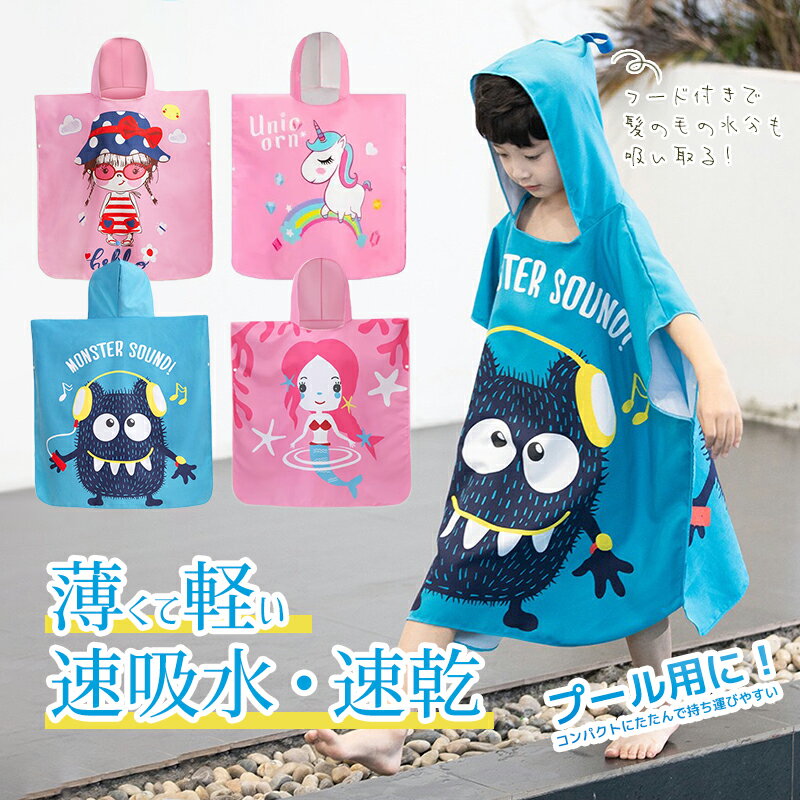 プールタオル 速吸水 速乾 ラップタオル フード付き キッズ 男の子 女の子 4種類