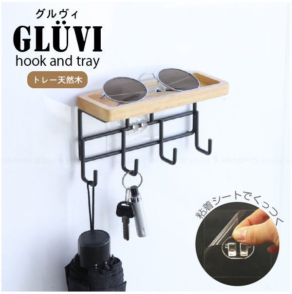 グルヴィ 吸着4連フック&トレー ERSS-4H / フック 4連フック トレー 天然木 玄関 小物 鍵 サングラス 印鑑 収納 整理整頓 粘着シート ディスプレイ