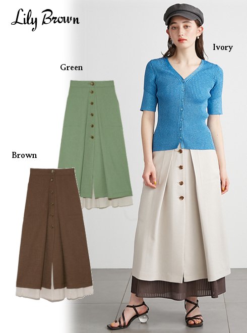 2021春夏. Lily Brown (リリーブラウン)プリーツコンビタックスカート優美な揺れ感が特徴のプリーツスカートに、タックスカートをレイヤードしたメリットセット。裾からのぞく柔らかなプリーツと構築的なタックのコントラストが目を引き、着映えを叶えてくれます。バックウエストはゴム仕様、タックスカートにはポケット付きなど、機能面もフォロー。それぞれ単品でも着用ができる他、タックスカートにお手持ちの柄スカートなどを合わせて着用したりと、コーディネートの幅をグッと広げてくれるセットです。タックスカートは少しハリのある素材でほんのりモードなイメージ。プリーツスカートは軽やかで動くたびに美しい揺れを楽しめます。■カラー:GRN、IVR、BRW■サイズ:0(S),1(M)■素材:[アウター]ポリエステル99%、ポリウレタン1% [インナー]表地:ポリエステル100%/裏地:ポリエステル100%■0(S):着丈80.5cm、ウエスト62.5cm、裾幅143cm 1(M):着丈80.5cm、ウエスト65.5cm、裾幅146cmメーカー希望小売価格はメーカーサイトに基づいて掲載しています