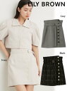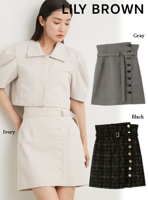2023春夏. Lily Brown (リリーブラウン)バリエーションミニスカートスタイルアップを叶えるハイウエストデザインのミニスカート。ウエストのボタンを外し折り返して着用するトレンド感のあるアレンジも◎。裾辺りのボタンホールはフェイクになっており、裾がはだける心配もなく安心して着用いただけます。バックウエストは体型に合わせてフィットするようゴム仕様に。ベルトは取り外し可能で単品としてもお使いいただけます。■カラー:IVR、GRY、BLK■サイズ:0(S),1(M)■素材:ポリエステル100%/裏地:ポリエステル100%■0(S):着丈49.5cm、ウエスト68cm、ヒップ97cm、裾幅53cm 1(M):着丈48.5cm、ウエスト65cm、ヒップ94cm、裾幅51.5cm