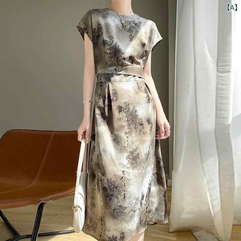 ワンピース レディース モダンチャイナ風 水墨画プリント サテン ポリエステル ラウンドネック 半袖 Aライン ロング丈 ゆったり 上品 春夏 プルオーバー