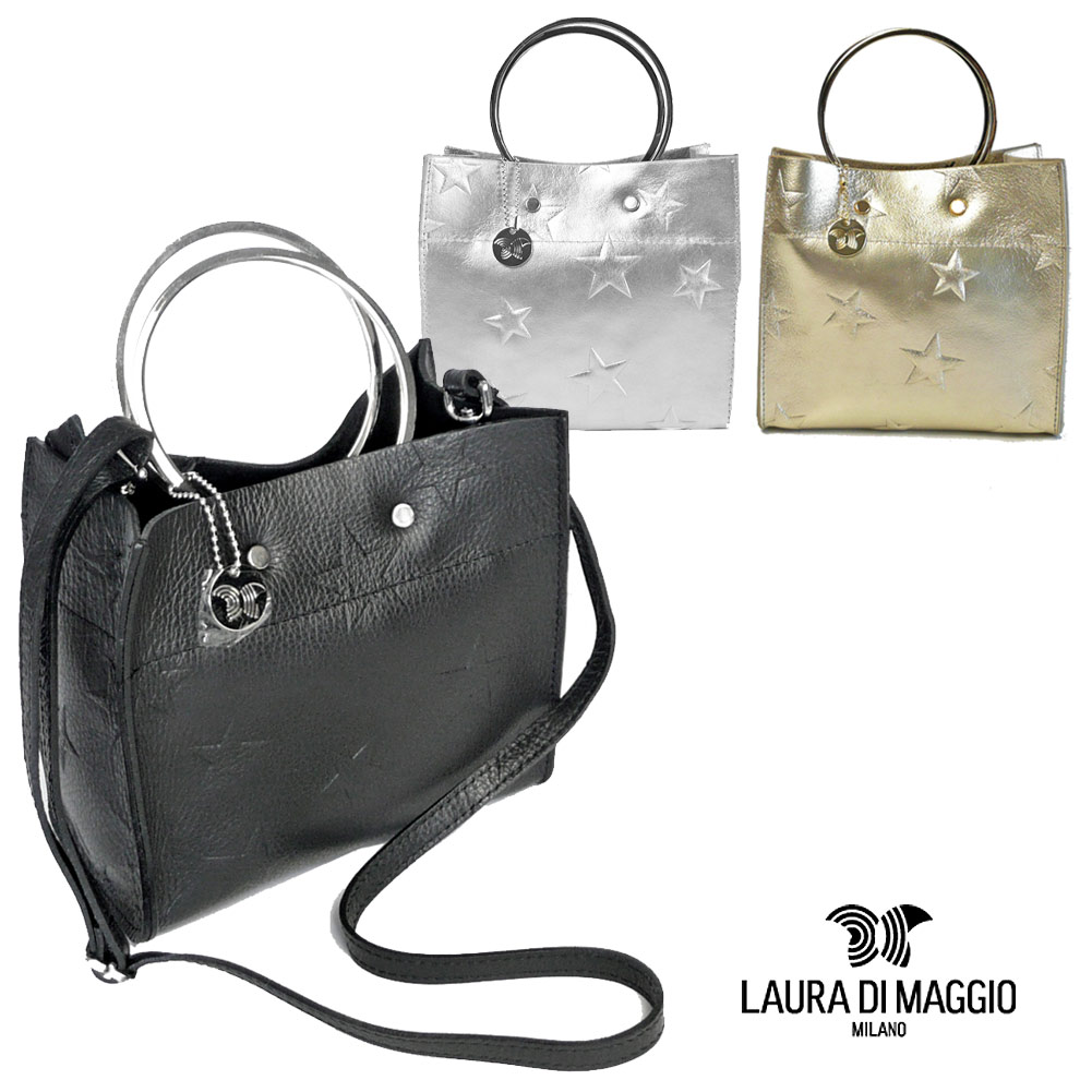 ラスト1点 ローラ ディ マッジオ LAURA DI MAGGIO カーフレザー 2way リングハンドル ミニバッグ レディース 星型押し 227スターモチーフ スター 星柄 星 ブラック 黒 シルバー ゴールド メタリック laura di maggio