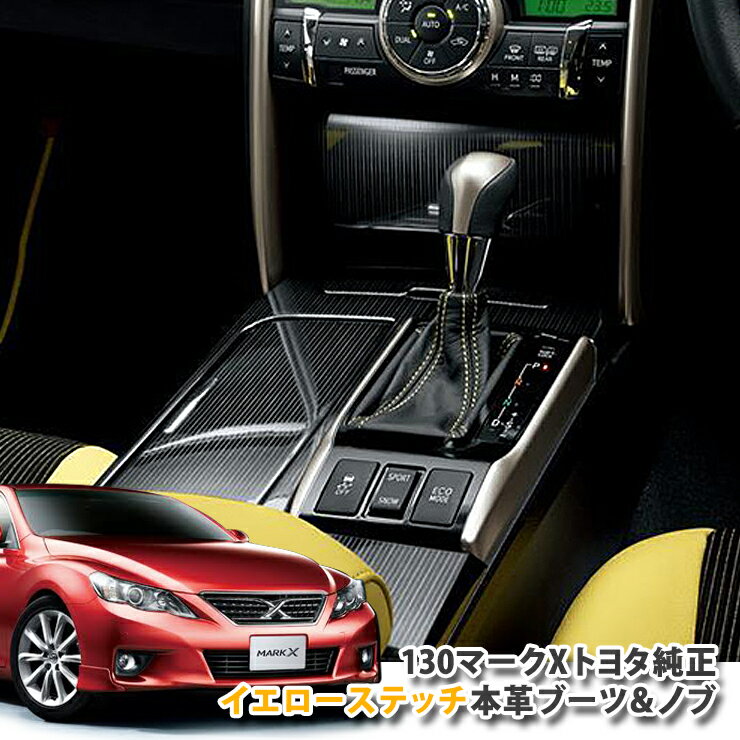 【トヨタ純正】GRX130系 マークX Yellow Label用、シフトノブと本革ブーツセット。(イエローステッチ入り) 特別仕様車 Yellow Labelに装備されているシフトノブ、ブーツ、パネル のセットです。 シフトブーツには、お洒落なイエローステッチ入り。 簡単に室内のイメージチェンジが可能。 お手軽に高級感溢れる車内にイメージチェンジ♪ 【ご注意】 お届けまでにお時間がかかる場合がございますので、お急ぎの場合は事前にお問い合わせ下さい。