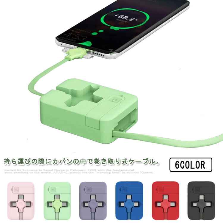 持ち運びの際にカバンの中で巻き取り式ケーブル。からまる度にほどいて整理が大変なケーブルをスマートにまとめる1本3役のケーブルで解決!万一の時にお出かけ時に持っていると便利、出張や旅行に最適。各種コネクタヘッドとケーブルは共用可能。ケーブル1本でiPhone, microUSB, Type-Cの接続が可能なのでごちゃごちゃせずスッキリします。 サイズFサイズについての説明ケーブル長さ:40-100cm ※商品のサイズは手作業で測定させて頂いておりますので、若干の誤差があります。素材プラスチック色カラー1 カラー2 カラー3 カラー4 カラー5 カラー6備考 ●製造ロットにより、細部形状の違いや、同色でも色味に多少の誤差が生じます。●パッケージは改良のため予告なく仕様を変更する場合があります。●出荷前に全て検品を行っておりますが、万が一商品に不具合があった場合は、お問い合わせフォームまたはメールよりご連絡頂けます様お願い申し上げます。速やかに対応致しますのでご安心ください。▼商品の色は、撮影時の光や、お客様のモニターの色具合などにより、実際の商品と異なる場合がございます。あらかじめ、ご了承ください。▼同じ商品でも生産時期により形やサイズ、カラーに多少の誤差が生じる場合もございます。▼他店舗でも在庫を共有して販売をしている為、受注後欠品となる場合もございます。予め、ご了承お願い申し上げます。▼サイズ詳細等の測り方はスタッフ間で統一、徹底はしておりますが、実寸は商品によって若干の誤差(1cm〜3cm )がある場合がございますので、予めご了承ください。
