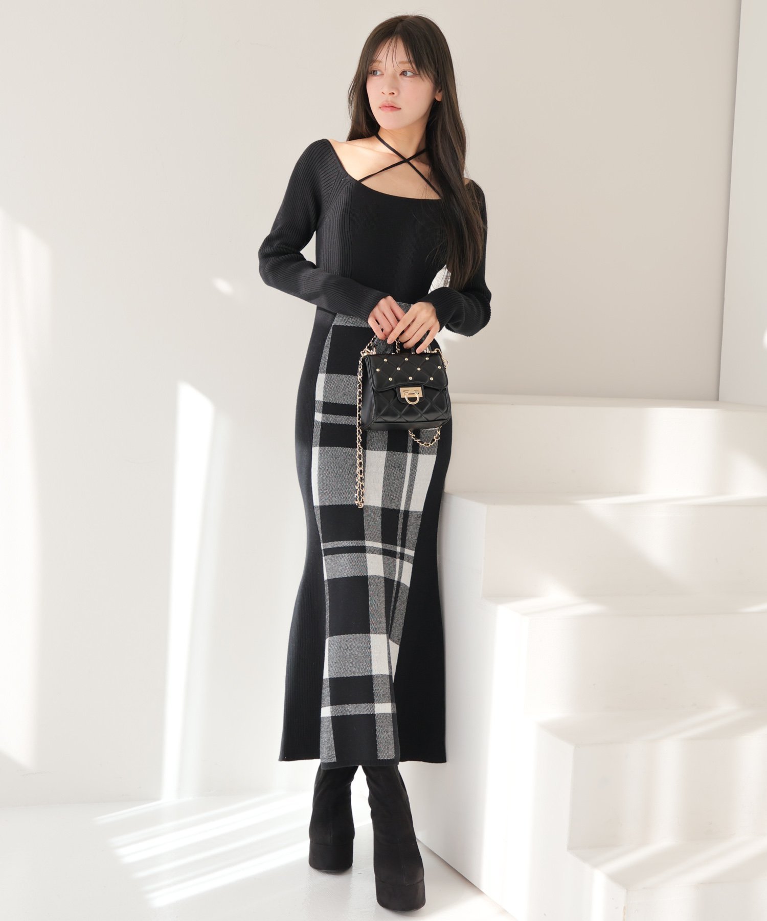 チェックカラーフレアニットワンピース/リップサービス(LIPSERVICE)