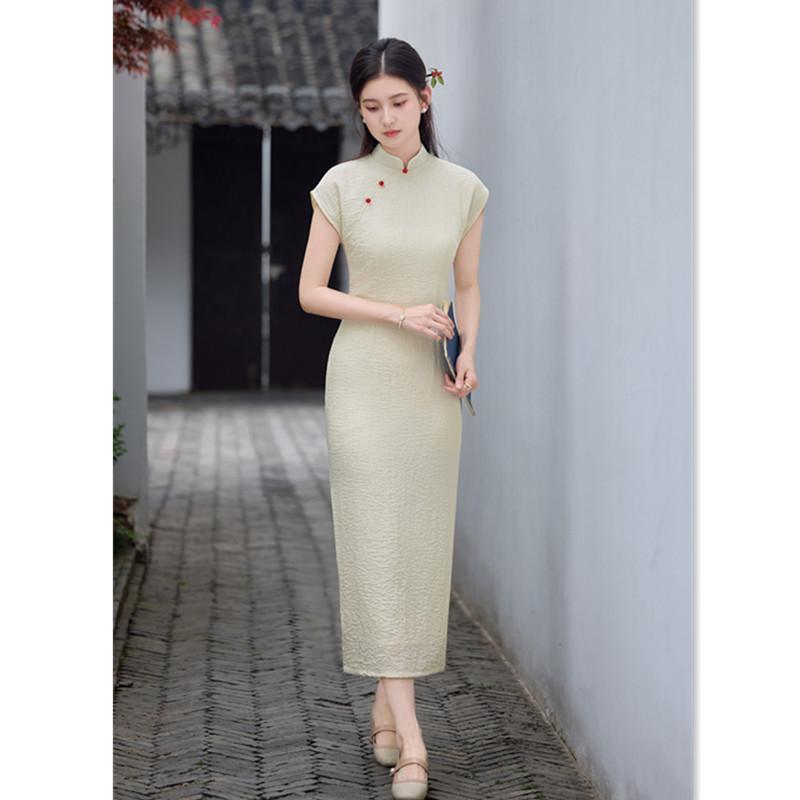 チャイナドレス レディース 新中国風 上品 エレガント コットン ポリエステル ロング丈 連袖 ドルマンスリーブ スタンドカラー 斜め襟 スリムフィット タイト ストレッチ 普段使い デイリー 春夏