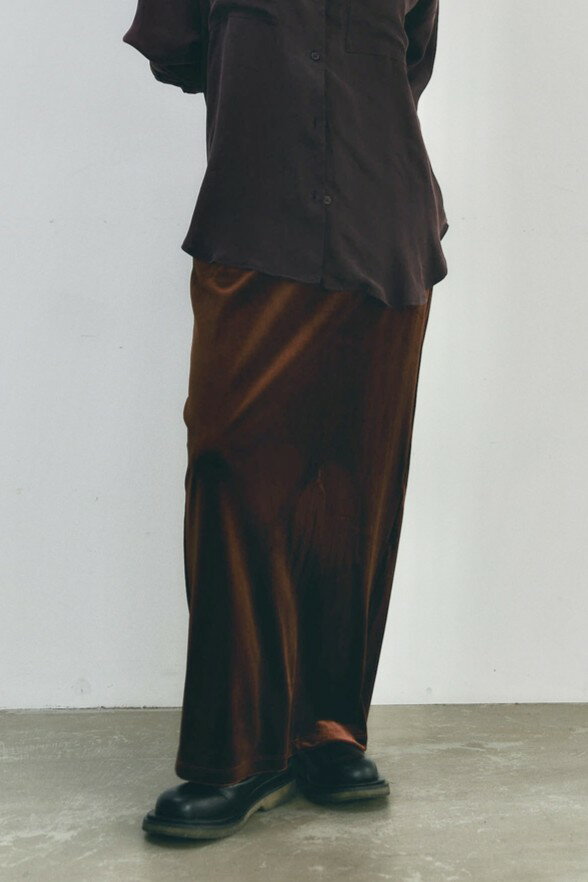 光沢感のあるベロア素材のタイトスカート。 ウエストは後ろのみゴム仕様で、伸縮性のある素材の為、ストレスフリーに着用頂けます。 綺麗めやカジュアルに幅広いスタイリングに◎ ※1〜2cm程度の誤差が生じる場合がございます。予めご了承下さい。 【素材】ポリエステル95% ポリウレタン5% 【SIZE】one 着丈 96cm ウエスト 64cm ヒップ 96cm 裾幅 48cm 【生産国】中国 【着用カラー】 1~6枚目:ORANGEBROWN 7枚目~:BLACK 【モデル】 1~6枚目:16cm 7枚目~:161cm
