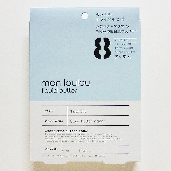 [スマートレターに付き送料無料]mon lou louモンルルトライアルセット:シャンプー2種、トリートメント2種、ボディウォッシュ2種、フェイスウォッシュ2種(各10ml)【liquid butter、シアバターアクア、ジャパンゲートウェイ】