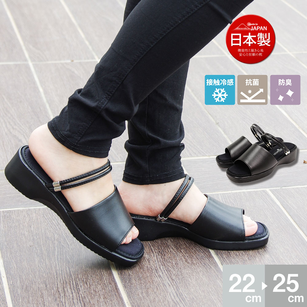 サンダル レディース つっかけ 接触冷感 厚底サンダル 室内履き サンダル レディース 厚底 クッション ウェッジソール ミュール サンダル ヒール オフィスサンダル オープントゥ ストラップ ウェッジサンダル 履きやすい 春 夏 日本製 黒 ブラック 75602 送料無料