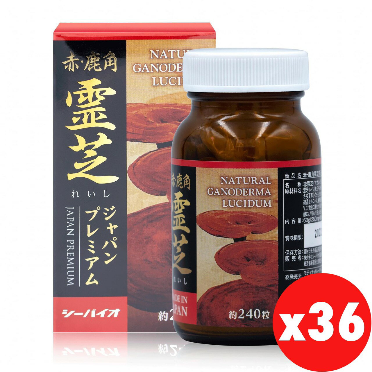 送料無料 1ケース(36個)セット 赤・鹿角霊芝 ジャパンプレミアム 240粒 サプリ サプリメント 霊芝 マンネンタケ 赤霊芝 鹿角霊芝 冬虫夏草 イチョウ葉エキス Reishi Japan Premium natural ganoderma lucidum supplementmade in Japan