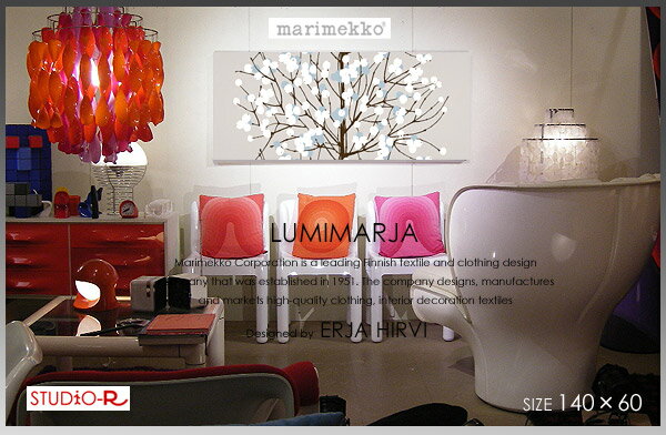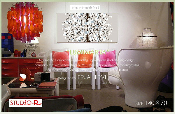 ■Marimekko/マリメッコ ■ファブリックパネル/ファブリックボード ■LUMIMARJA/ルミマルヤ ■Designed by ERJA HIRVI ■color:写真参照 2004年にErja HirvがデザインしたLUMIMARJA(ルミマルヤ) デザイン名は、雪イチゴの意味。 北欧の寒い冬を連想しますが、デザインは温かみがあり、季節問わずお使いいただけます。 和のテイストも感じられますので、和室にもお勧めです。 人気のLumimarjaの特注サイズです。数量限定で特価で販売中! パネル中央に幹を配置し、バランスよく製作いたします。 ■本来の柄を忠実に表現するため、 木目が透けないように白生地を貼り、 ホワイト加工を施しています。 ■長くお使いいただけるように、 防臭&抗菌加工を仕上げに施しています。 ■付属品として、壁掛け用の吊金具、紐、ねじの3点をお付けします。 ■パネル裏側はテープで綺麗に化粧仕上げをし、当店オリジナルのステッカーとデザイン名、デザイナー名のステッカーを貼り付けております。