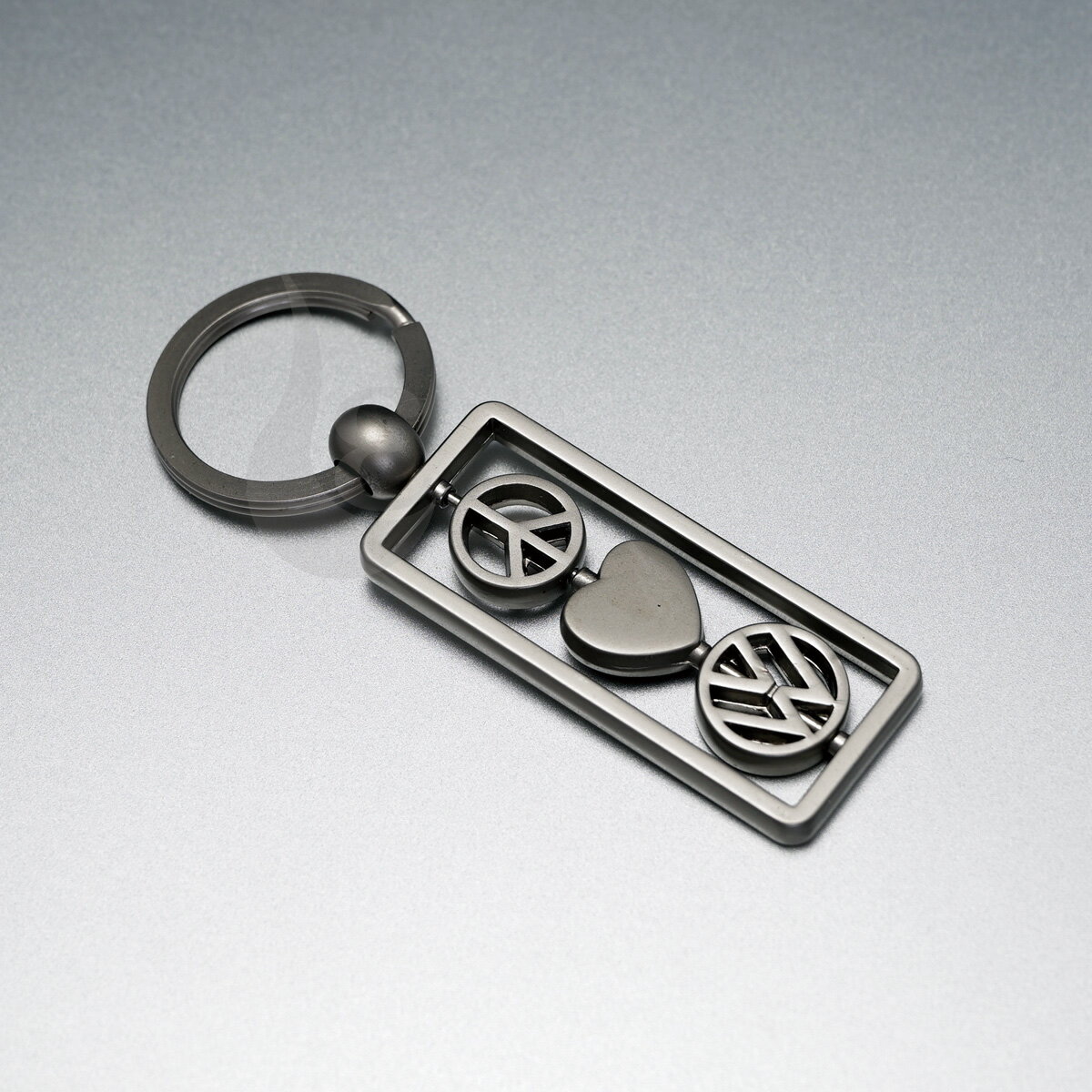 Peace & Luv !! 連なったVWのアイコンのキーホルダー。アイコンはくるくる回転します。 かわいらしい見た目に、渋いツヤ消しガンメタ色でかっこよさも兼ね備えています。 サイズ:約80×30mm / 重さ:約23g この商品はネコポスまたはレターパックでお送りします。 郵便ポストへの投函になりますので、安全性をお求めの場合は宅急便(別料金)をおすすめいたします。 宅急便に変更の場合は備考欄に「宅急便希望」とご記入ください。 *商品の多くが輸入商材です。商品にキズ、汚れが付着している場合があります。 *姉妹サイトでも販売しておりますので、商品の引き合い具合によりご注文いただいた後に売切れのご連絡をする場合があります。 *画像は実際の商品の色と多少異なる場合があります。