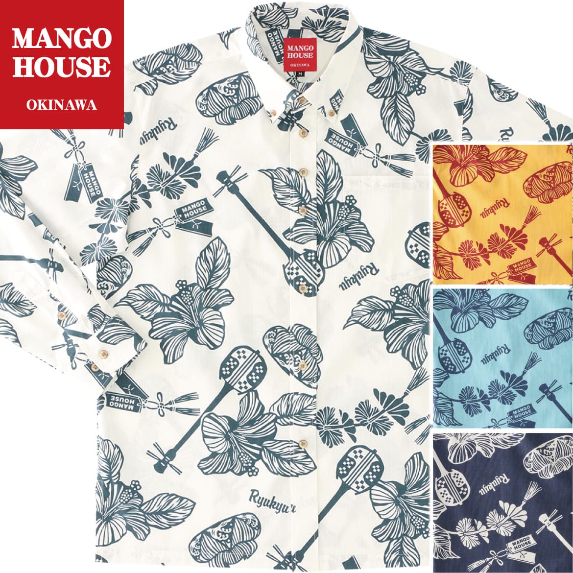 かりゆしウェア メンズ 結婚式 ゴルフ 沖縄 かりゆし シャツ アロハ アロハシャツ ボタンダウン MANGO HOUSE マンゴハウス 国産 リゾート お揃い ペア 長袖シャツ 琉球三線ミュージック(ボタンダウン)