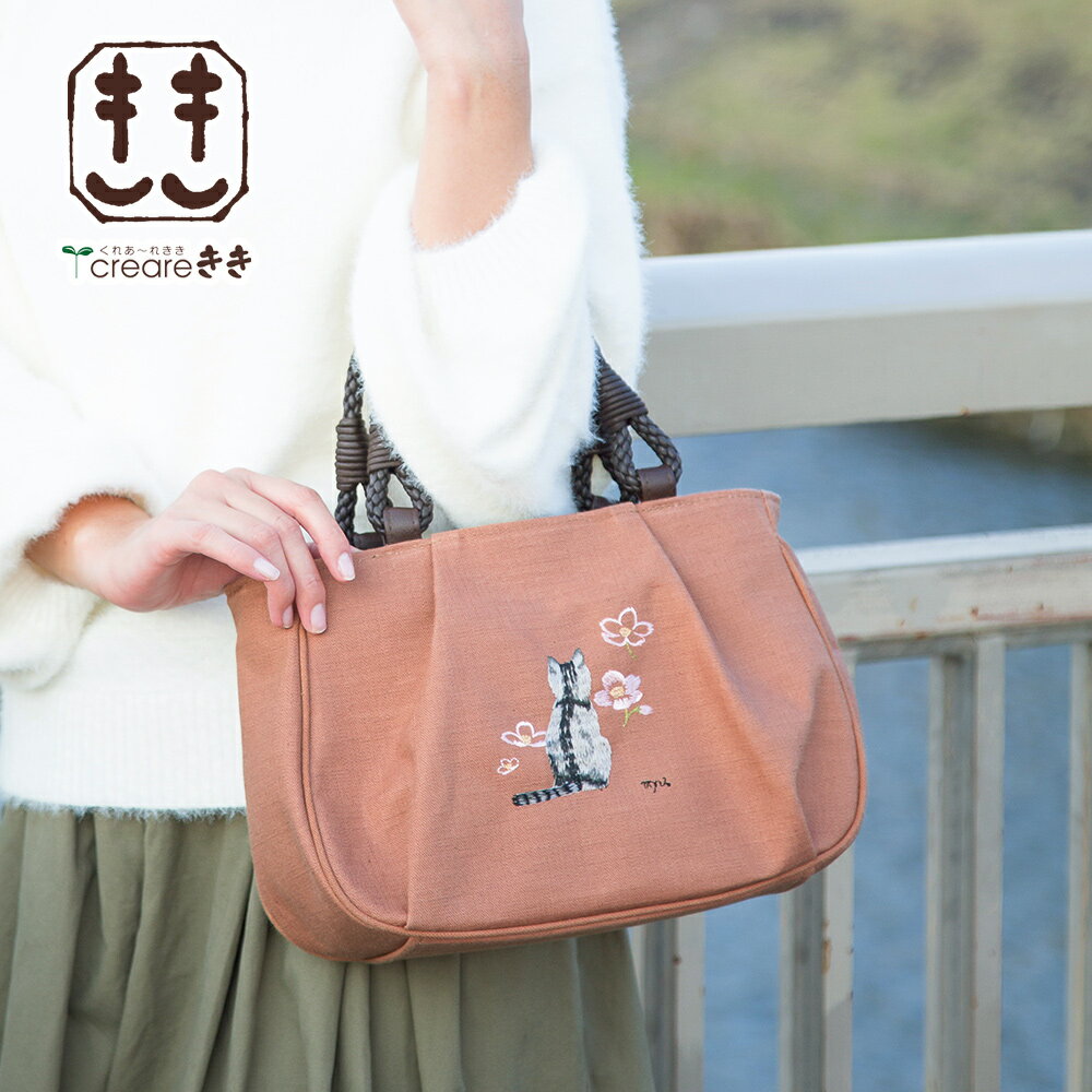 柿渋染め 和装バッグ カジュアルトートバッグ レディース 軽い 日本製 ねこ柄 刺繍 アオリ手提げ マロン 大人 女性 退職祝い 結婚記念日 還暦祝い 母 お母さん 誕生日 プレゼント 実用的 ギフト 古稀 喜寿 お祝い 50代 60代 70代 80代[くれあーれきき] KS-182sn