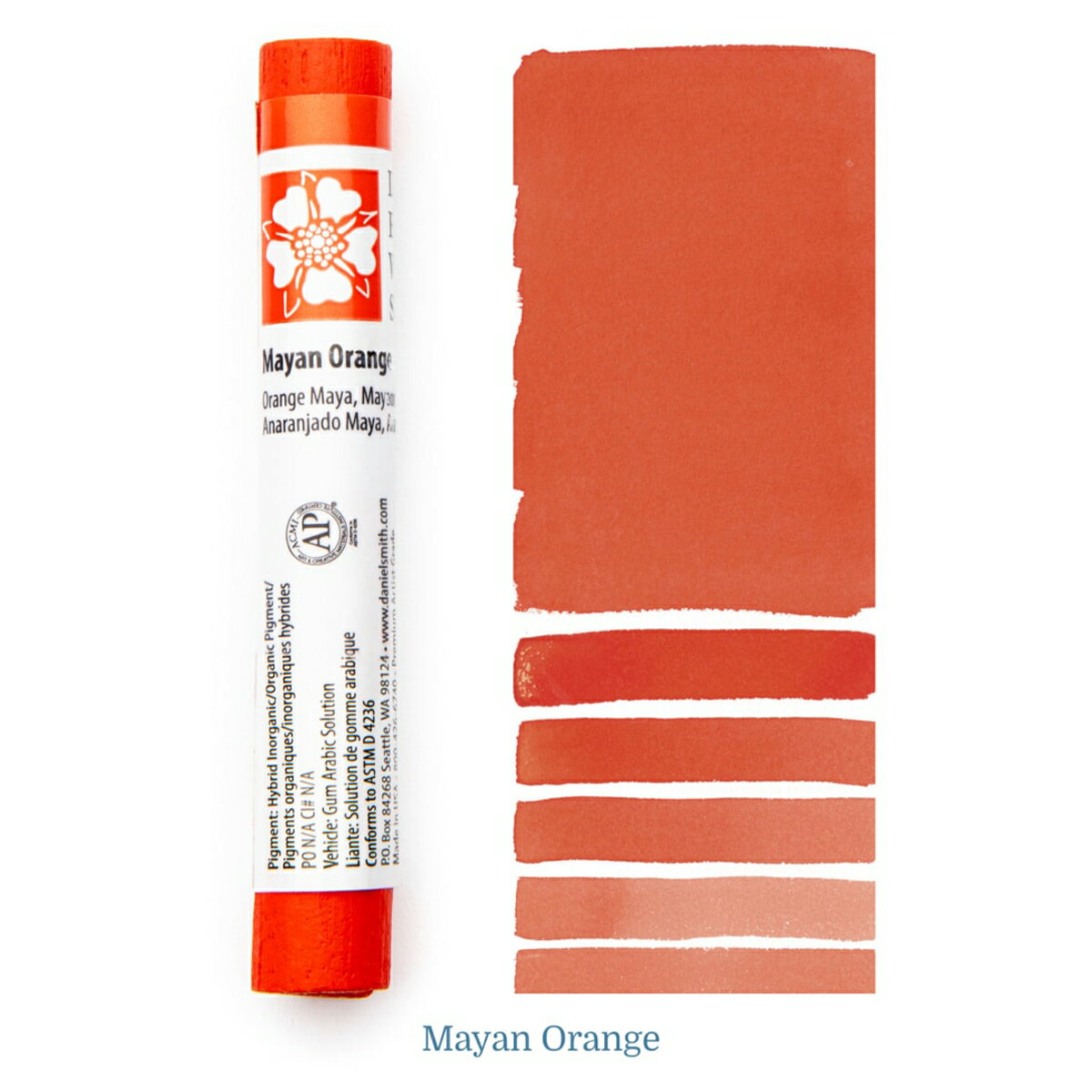 Mayan Orange 12ml - DANIEL SMITH Extra Fine Watercolor Stick SKU: 284670059 Pigment: PO N/A | Series: Stick Lightfastness: II - Very Good Transparency: Semi-Transparent Staining: 2-Low Staining Granulation: Non-Granulating Mayan Orange is hot and intense. Use it straight from the tube for a blazing red-orange. As you add water, the color remains strong and disperses very evenly. Rich, bold colors adorned the murals and sculpture of the Mayan people. Even when exposed to centuries of severe heat and humidity, these colors have hardly faded over a thousand years. Now, using methods derived from ancient Mayan chemistry, these unique, metal-free pigments have been recreated using an eco-friendly process. The colors are smooth, non-granulating and semi-transparent. Their versatility, durability and exquisite hues make them colors you’ll reach for again and again.