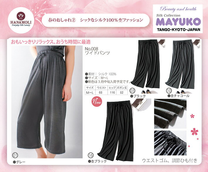 HANAMOLIシルク100% ワイドパンツ ウエストゴム 調整ひも付き M~L フリーサイズ おもいっきりリラックス おうち時間に最適 春のおしゃれ着 無地ニット カジュアル 上品 海外セレブ 冷え対策 保湿 毒だし 部屋着 mayuko silk100% レディース ファッション 上質中国製
