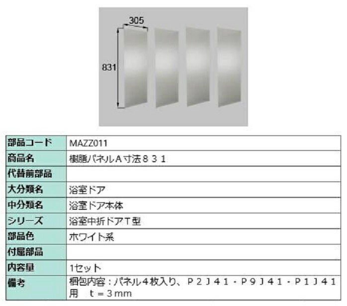 樹脂パネルA 831mm × 305mm / 4枚入り 部品色:ホワイト系 MAZZ011 交換用 部品 LIXIL リクシル TOSTEM トステム