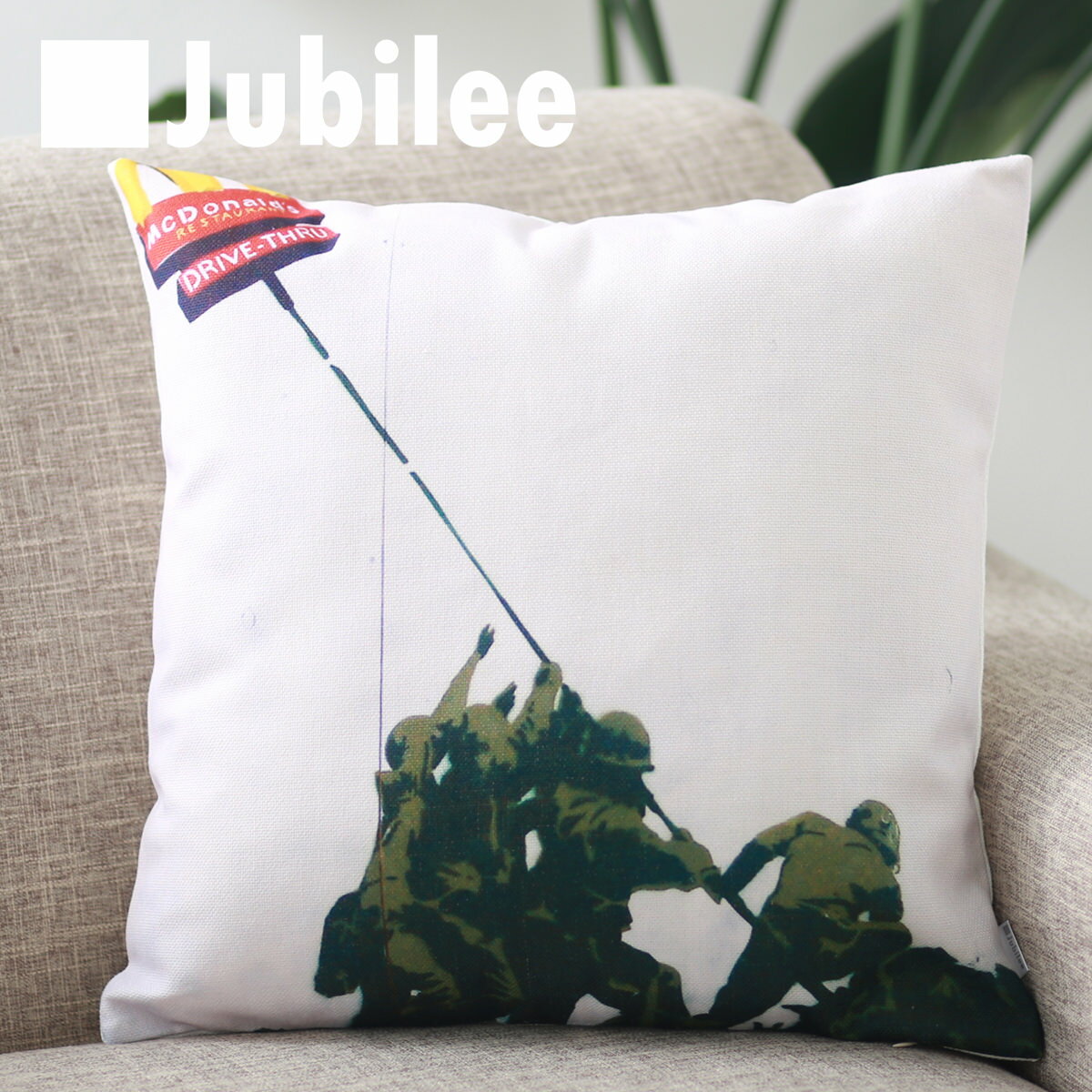 【バンクシー Banksy クッションカバー】 Cushion Cover 北欧デザイン 45×45cm リネン 天然の麻で出来たハンドメイド フラッグマクドナルド プレゼント ギフト 新生活 新居 引越し祝い 新築 子供 家 おうち おしゃれ