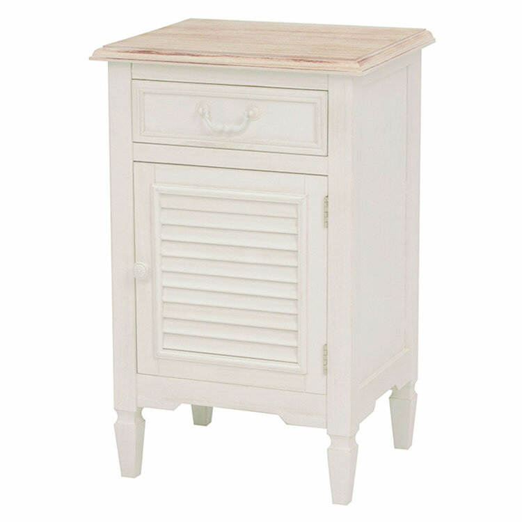 【返品種別A】□「返品種別」について詳しくはこちら□※この商品はアンティーク調の塗装を施しています。アンティーク調の塗装は職人が一品一品手作業で、程よく使い古したような風合いを表現する手法です。この為、一品一品塗装の色や風合いが異なります。塗装の濃淡、かすれは不良ではなく、この手法の特徴です。また表面を研磨する際の、白い粉が残る場合があります。その場合、固く絞った濡れタオルなどで拭き取ってからご使用ください。ご購入までにご確認、ご了承頂きますようお願い致します。◆優しい雰囲気と高級感を感じられるアンティーク調のルーバータイプのサイドチェストです。◆優しいホワイトアンティークカラーとナチュラル天板の組み合わせが可愛いサイドチェスト。◆どこにでも置きやすく、女性でも運びやすいコンパクトサイズのサイドチェスト◆かすれた質感や経年を思わせる、シャビーな雰囲気が漂うデザインがポイントです。【BROCANTE】(ブロカント)かすれたペンキや年月を経た木の質感など、シャビーテイストを再現したブロカントシリーズ。ブロカントとは物を愛し、長く大事に使用する欧州文化で大切にされてきた「美しい小道具」を意味します。◆引き出し付きちょっとした小物を収納できる引出し付き。ベッドサイドや玄関などにお勧めです。◆ルーバー扉収納付き引出し下にも収納スペースが付いています。高さがある物もしまうことが出来るので便利でルーバー扉が付いているので見た目もスッキリ。◆取っ手、天板、脚お洒落ヨーロピアン調の取っ手や脚のデザイン、桐材の素材感などディテールにこだわりました。部屋馴染みの良い、かすれた質感のシャビーな雰囲気漂うデザインがポイントです。※この商品はアンティーク調の加工を施しています。アンティーク調の加工は職人が一品一品手作業で行っておりますので塗装には個体差があります。塗装の濃淡・かすれなどは不良ではなくアンティーク塗装の特徴です。また表面を研磨する際の、白い粉が残る場合があります。その場合、固く絞った濡れタオルなどで拭き取ってからご使用ください。ご購入までにご確認、ご了承頂きますようお願い致します。■ 仕 様 ■サイズ(約):幅40×奥行32×高さ63cm扉内内寸(約):幅28.5×奥行27.5×高さ29.5引出内寸(約):幅26×奥行23.5×高さ5.5主材:桐材、MDF桐突板重量(約):5.5kg完成品[MCH6166WH]萩原生活家電>収納家具>チェスト・衣類ケース・衣類収納>チェスト(タンス)