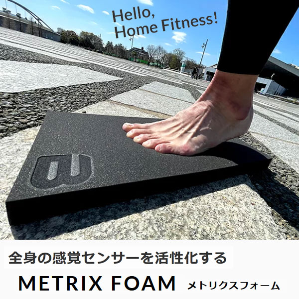 METIX foamを使ったトレーニング&リハビリマットです。 ボード上で軽い運動をすることで足裏、足指のセンサーを活性化し、自然と正しい姿勢に促してくれるので、腰痛予防や健康増進が望めます。 METRIX foam(メトリクス フォーム)とは、ボディメトリクスジャパンが独自に開発した高反発EVA(エチレンビニルアセレート)素材です。 優れた弾力性と反発力、柔軟性が特徴的。更に軽量で、耐久性にも優れています。脳から一番遠く、唯一地面と接地している足指・足裏に多く分布するセンサーを活性化するので、自然と正しい姿勢に導いてくれます。 足裏・足指のセンサー機能のアクチベーション(活性化) ローカル筋(体幹深層筋)のアクチベーション(活性化) 高反発EVAの最適な硬度 サイズ:400 x 200 x 25 素材:EVA樹脂 ●高反発EVAの反発力 ●全身のセンサー(深部感覚)が活性化する ●グローバル(外側)筋が緩み、ローカル筋(内側)筋が活性化する ●力み(緊張)が減り、しなやかな姿勢、しなやかな動きに