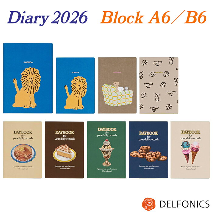 品名 2026 A6ブロック B6ブロック ダイアリー カラー 全8色: ・アメリカンスイーツ:A ホットケーキ / B レモンタルト / C チョコレートパフェ / D チョコレートクッキー / E アイスクリーム ・WARMGREY TAIL:ホワイト(ウサギ) / グレージュ(動物とソファ) / ブルー(ライオン) サイズ A6:横100×縦145×厚さ10mmB6:横128×縦182×厚さ12mm 期間 2025年10月始まり〜2026年12月 仕様 ・カレンダー:年間+見開きマンスリー+見開きウィークリー ( ブロックタイプ ) ・方眼メモ ・A6のみコーナーカット付き 生産国 日本 配送について 税込2,200円以上のご購入で送料無料です。ヤマト運輸ネコポスで、翌日〜翌々日のポスト投函です。*運搬中に傷まないよう、厚紙製レターケースでお届けします。 注意事項 *ご購入を希望される多くのお客様に、お一人でも多くご購入いただきたく、ご購入はそれぞれ1点まででお願いいたします。(複数回に分けてご購入された場合は、キャンセルさせていただく場合がございます。)*画像は可能な限り品物を再現するよう心掛けておりますが、ご覧の環境により多少の差異が生じますので、あらかじめご了承ください。*ダイアリーは販売期間限定品のため、返品およびご交換はお受けしておりません。DELFONICSの定番 ブロック ダイアリー デルフォニックスが創業当初から作り続けてきた、デルフォニックスの原点とも言えるダイアリーです。 スケジュール管理がしやすく、仕事、学校、暮らしと様々な使い方が可能な機能を備え、アナログ手帳のみに集約したい人へも最適な1冊です。 2026年限定品は、960年代以前の雑誌広告をイメージして甘いスイーツを描いた『アメリカンスイーツ』と韓国のクリエイターチーム ワームグレイテイル のファニーな作品を配した『WARMGREY ATIL』の2種です。 その他のダイアリーはこちらから