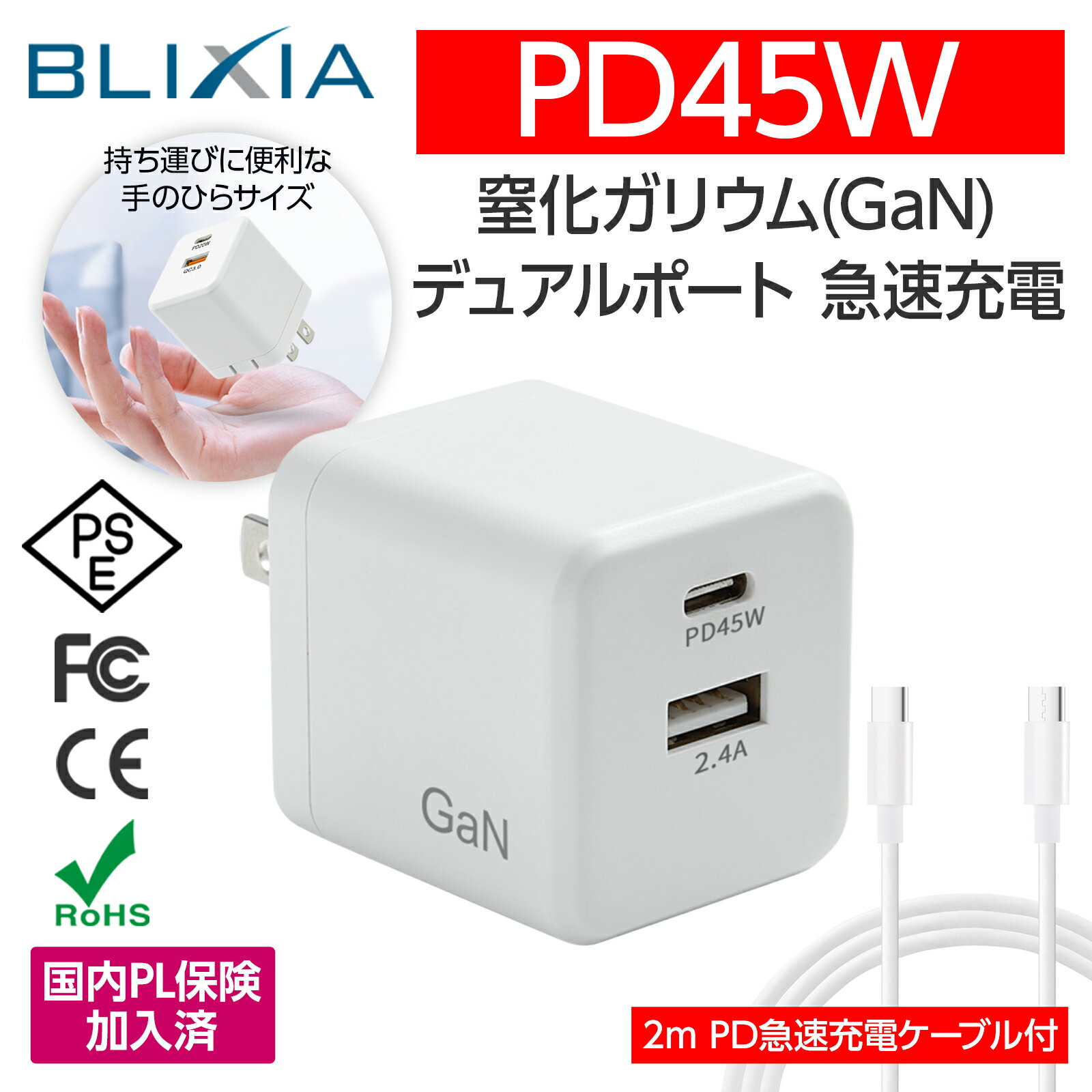 BLIXIA PD 45W 急速充電器 GaN (窒化ガリウム)採用 USB-A USB-C コンパクト 海外 100V〜240V PD3.0対応 PSE認証済 折畳式 iPhone対応 iPhone/iPad Pro/MacBook/Surface pro/Switch等USB-C対応 2mPD対応ケーブル付 安心の国内PL保険加入