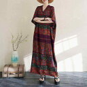 ワンピース 春夏 リゾート 旅行 カジュアル Vネック 体型カバー ゆったり ロング丈 半袖 コットンリネン プリント ストライプ柄 レッド レトロ(x2)