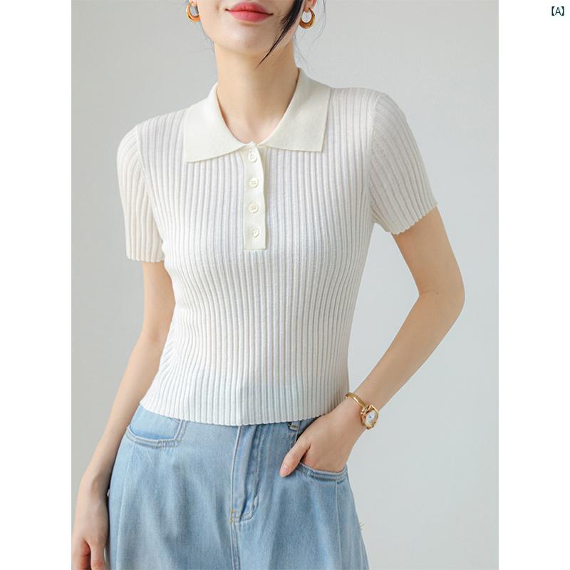 レディース ファッション レディース オシャレ コーデ 春 秋 夏 ホワイト ポロ カラー ピット ストリップ スリム 半袖 セーター レディース 夏 薄手 ボタン ショート プルオーバー Tシャツ