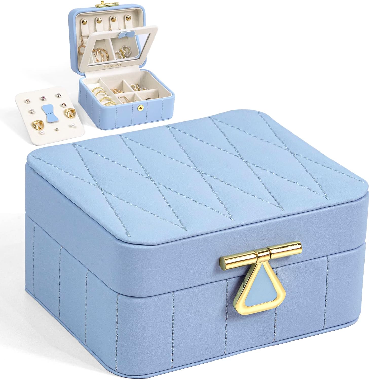トラベルジュエリーボックス オーガナイザー ダイヤモンドキルト レザー トラベルジュエリーオーガナイザーボックス 女性用小さなジュエリーボックス ポータブルトラベルジュエリーケース ミラー付き ブルー