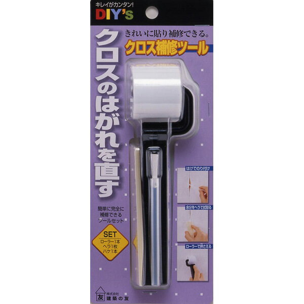建築の友の一覧はこちらクロスのあらゆるトラブル解決に!ピン穴、すきま、汚れ、破れ、落書きを一発解決!〈特 徴〉●ピン穴にはクロスの穴うめ材スーパー、すきまにはクロスのすきまシール、はがれにはクロス専用のり、汚れにはクロス消しゴム、落書きにはクロスの落書きと気になるクロスのトラブルを解決する便利なセット〈使用方法〉(1)まず始めにクロス消しゴムでクロスを破れないように気を付けながらクロスの落書きを消せるだけ消します。(2)キャップをしたままで、落書きかくしをよく振ってください。(3)落書きかくしのノズルを外してボトルの中栓を外してください。(中栓は保管してください)(4)落書きが消えにくい場合、一度乾燥させてから重ね塗りをしてください。【クロスに釘やピンの抜き穴ができた場合】(1)クロスの穴うめ材スーパーのノズルを外して、ボトルの中栓を外してください。(中栓は保管してください)(2)ボトルにノズルを取り付けて、ノズルの先端を穴にあて、軽く押し出します。(3)穴が埋まれば付属のヘラで軽くすき取り、きれいな水でしぼった布やスポンジ等で、はみ出した部分をふき取ってください。(4)クロスの穴うめ材スーパー同士で調色する場合、絞り出して調色した後、つま楊枝等で埋めてください。(5)クロス表面の凸凹を再生する場合、周囲の凸凹に合わせて盛り付けてください。乾燥後、ドライヤーで温めますとより自然な膨らみの凹凸が再生できます。(6)着色や熱膨張をする場合、施工後24時間(完全乾燥後)に行ってください。【クロスのつなぎ目にすきまができた場合(クロスがはがれていない場合)】(1)まず始めにクロスのすきまシールのノズルを外して、ボトルの中栓を外してください。(中栓は保管してください)(2)ボトルにノズルを取り付けて、ノズルをすきまに沿って、なるべくはみ出さないように押し出して埋めてください。(3)はみ出した場合、付属のヘラで軽くすきまに沿ってすき取り、きれいな水でしぼった布やスポンジ等で、はみ出した部分をふき取ってください。(4)クロスのすきまシール同士で調色する場合、絞り出して調色した後、ハケ塗りをしてください。(5)クロスつなぎ目の凸凹を再生する場合、周囲の凸凹に合わせて盛り付けてください。乾燥後、ドライヤーで温めますとより自然な膨らみの凹凸が再生できます。(6)着色や熱膨張をする場合、施工後24時間(完全乾燥後)に行ってください。〈使用上のご注意〉●使用後は、ノズルをきれいに拭いてから中栓、キャップをして保管して下さい。●手や服に付いた時は、すぐに拭き取り水洗いして下さい。●次回使用時にノズルの先が硬化している場合は、ノズルをはずし、細いものでノズルの先端から硬化した部分を押し出して下さい。●クロスの穴うめ材スーパー及びクロスのすきまシールは発泡後、もとの色より薄くなります。●使用後は、ハケをきれいに拭いてからキャップをして保管して下さい。●直射日光を避け、0度以上で保管して下さい。●幼児の手の届かないところへ保管して下さい。JANCD:4936068403063【メール便対応】その他、配送方法をお選び頂く事は出来かねます。合計金額による送料無料対象外の商品です。【銀行振込・コンビニ決済】等前払い決済予定のお客様へ当商品は弊社在庫品ではなく、メーカー在庫品です。在庫確認後に注文確認を行い、お支払いのお願いを送信させて頂きます。休業日、14:00以降のご注文の場合は翌営業日に上記手続きを行います。お時間が掛かる場合がございます。