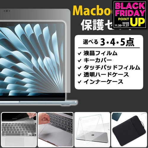 【 MacBook Airを総合保護|3点・4点・5点セット 】対応:MacBook Air 13(2020 / M1)および 13.6(2022 / M2、2024 / M3、2025 / M4)対応モデル・13インチ(2020):M1 A2179 / A2337・13.6インチ(2022〜):M2 A2681 / M3 A3113 / M4 A3240セット構成3点セット:液晶保護フィルム(BLカット・反射防止)+キーボードカバー(JIS)+トラックパッドフィルム4点セット:上記3点+クリアハードケース(上下分離)5点セット:上記4点+インナーケース(取っ手付き)液晶保護フィルム・ブルーライト平均20%カット(380〜500nm)で目の負担を軽減。・反射防止(ノングレア)+指紋防止。全光線透過率:約92〜95%。・硬度3〜4Hのハードコート。傷に強く液晶画面を保護。・カラーは薄いブルーグレーで自然な表示。キーボードカバー・JIS配列(日本語)専用設計。薄型で打鍵の感触を損ねにくく、水洗いOK。・水分・ホコリ対策に。0.25mm薄さで見た目が変化しにくい。※海外版MacBookのキーボードには非対応。トラックパッドフィルム・指触頻度の高いパッド面を傷・汚れから保護。クリアハードケース(4点/5点)・高品質のポリカーボネード製。傷や衝撃をしっかりカバー。・上下分離型で着脱簡単。通気スリット+四隅ゴム足で放熱と滑り止めに配慮。・ポート干渉の少ない専用形状。インナーケース(5点)・パソコン保護に適したシンプルなケース。・軽量かつ丈夫で傷に強い。お使いのPCを保護します。・メインポケットの内側は厚み8mmの起毛素材で衝撃を吸収。・安心の防水&撥水加工で雨の日も安心。(完全防水ではございません。)・取っ手付きで縦型バックとしても利用可能。※素材:ポリエステル(撥水)/ 取っ手付き・サイドポケット1。※外寸:約380×270×25mm/内寸:約360×250mm/重量:約245g。※カラー:ブラック注意事項・貼付前にサイズ確認と仮合わせを行ってください。ホコリ除去は入念に。・破損の恐れがございますので、取り付けの際には液晶画面を強く押さないよう注意し、丁寧に貼り付けてください。・一部大型の電源アダプタはインナーケースに収まらない場合がございます。・ご使用上、問題のないほつれ等が生じている場合がございます。これは製法上の仕様になり、そのままご使用をお願いいたします。・落下等による衝撃、機器の破損・損傷については責任を負いかねます。・ご購入前にMacbook Air本体裏面のモデルナンバーをご確認ください。・MacBook Air 本体は付属しておりません。ブランドメディアカバーマーケットはパソコン・タブレット・スマートフォンなどの各種機器向け保護フィルム/アクセサリーを専門展開する国内ブランドです。法人・教育機関での採用実績もあり、安心の品質をお届けします。品質保証商品到着時、ご注文と異なる商品や初期不良があった場合、1週間以内にメールでご連絡ください。商品交換またはご返金にて対応いたします。「貼る・守る・運ぶ」をこの1セットで。画面はブルーライトカット&反射防止加工で見やすく、キーボードとトラックパッドもピンポイントに保護。4点/5点セットならクリアケースやインナーケースまで揃い、日常〜持ち運びまでトータルにケアできます。対応モデルはM1(13)からM2/M3/M4(13.6)まで。用途に合わせて3・4・5点からお選びください。幅広い商品を展開し、法人・教育機関にも導入実績豊富な国内ブランド【メディアカバーマーケット】3点セット 4点セット 5点セットフィルム キーボードカバー トラックパッドフィルム クリアケース インナーケース■対応機種MacBook air 13 M1機種用とMacBook air 13.6 M2、M3、M4機種用【3点セット・4点セット・保護する5点セット】MacBook Air専用の液晶保護フィルム、キーボードカバー、トラックパッドフィルムがセットになった3点セットと専用のクリアカバーケースがセットになった4点セット、さらにインナーケースもついた5点セットの3種類から選べます。【3点セット】・キーボードカバーぴったりフィットで故障の原因になりやすい水、ほこり、ゴミなどからキーボードをお守りします。専用設計なので違和感なく快適な打ち心地です!つけたまま閉じることができ水洗いもOK!(キーボードカバーは日本語用キーボードのみ対応)・トラックパッドフィルム最も触れる場所をぴったりサイズでキズから守ります。剥がしてもあとが残らないので新品同様のキレイな状態を維持します。・液晶保護フィルム見た目の変化が少なく目に優しい液晶保護フィルムです。反射防止加工で蛍光灯などの光の映り込みを軽減して、画面を見やすくします。指紋防止加工で指紋がつきにくく、ふき取りやすいフィルムです。【クリアケース】専用クリアケースが傷や汚れ、ほこりからしっかり保護します。上下クリアケースが分離しており単体での使用が可能です、取り付けや取り外しも簡単に操作できます。USBポートやイヤホンジャックに干渉しない快適設計です。底部の四隅にはゴム足付きで机との間に隙間ができることで放熱しやすくなり、本体が滑るのを防止できます。【インナーケース】大切なパソコンをしっかりと守って