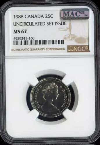 1988 Canada 25 Cents 25C MS67 MAC Quality商品について額面 25セント流通/非流通組成 ニッケル発行年 1988年認証番号 N/A純度 0.8グレード MS 67KM番号 62b統治者 エリザベス2世製造国/地域 カナダ種類 エリザベス2世 (1952-2022)認証 NGC注意事項※以下の注意事項をご理解のうえ、ご購入ください■ 鑑定済みコイン・紙幣について各種コイン・紙幣の鑑定機関(NGC、PCGS、PMGなど)は、収集品の真贋鑑定およびグレーディングを行う専門機関です。鑑定後の商品は、専用ケース(スラブ)に封入され、状態を示すグレードが付与されます。■ グレードについてグレードはコイン・紙幣自体の状態を評価するものであり、ケース自体の品質や状態を保証するものではありません。製造・輸送時の影響により、以下のような状態が発生する場合がございます。- 軽微なスレ傷・拭き傷(特に光の角度で見えるもの)- ケース内部のホコリ・小さな異物(鑑定機関の検品基準を満たしている場合)- ラベルのズレ・わずかな傾きこれらは鑑定機関の基準内であり、返品・交換の対象とはなりませんのでご了承ください。■ ラベルの種類について各鑑定機関では、コイン・紙幣の状態や鑑定の結果に応じて異なるラベルが付与されます。- 通常ラベル(Standard/Regular):一般的なグレード付き鑑定済みコイン・紙幣- オーセンティック(Authentic):グレードなしで真贋のみ保証- 詳細グレード(Details):クリーニング跡やエッジのダメージがあるが本物と認定- 特別ラベル(Special Label):記念版や特定のデザインの限定ラベル - 例:NGC「Early Releases」「First Releases」、PCGS「First Strike」 などグレードやラベルの種類は、商品画像および説明文をご確認のうえ、ご購入ください。■ 在庫状況について当店の商品は海外から取り寄せております。ご購入のタイミングによっては在庫切れとなる場合がございます。その際はご連絡のうえ、ご注文をキャンセルさせていただく場合がございますので、あらかじめご了承ください。■ ご注文後のキャンセルについてご注文と同時に商品のお取り寄せを開始するため、お客様都合によるキャンセルは承っておりません。■ 配送についてお届けまでに通常2〜3週間ほどかかります。海外の祝日や天候、税関手続きにより通常より配送が遅れる可能性がございます。■ 保証について商品説明に英語で「保証(warranty)」と記載があっても、日本国内では適用されませんのでご了承ください。 当店では、商品到着後7日以内の初期不良に限り、対応させていただきます。 (返品規約の詳細については、楽天市場内の会社概要欄下部をご参照ください。)■ 商品の色・素材感について撮影環境やモニター設定により、実際の商品と色味や質感が異なる場合がございます。■ 価格変動について希少性の高い商品は市場価格の変動により、追加料金をお願いする場合がございます。追加料金に同意いただけない場合には、ご注文のキャンセルが可能ですので、ご安心ください。■ その他サービスについて海外製品の輸入代行も承っております。ショップに掲載されていない商品でもお探し可能ですので、お気軽にご相談ください。尚、業者販売(業販)や複数購入の場合、割引対応も可能です。ご希望の方はお問い合わせください。