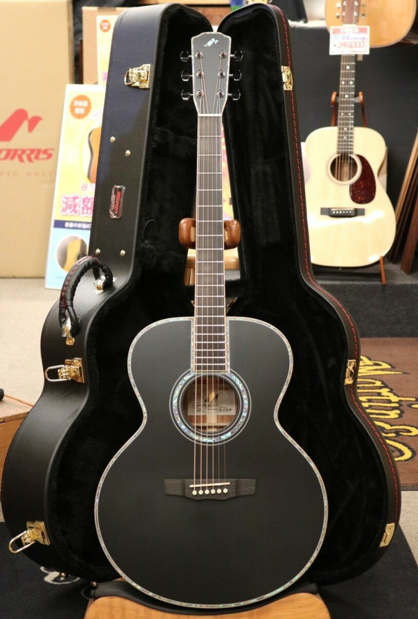 ------------------------------------------------------------------------- 【Morris】 言わずと知れた国産ギターの雄『Morris/モーリス』は長野県にて1967年より楽器製造をはじめ日本のフォークブームの一翼を担った老舗ブランド。手の込んだハンドメイドのアコースティックギターを低価格で提供をしており1970年以降代初めて手にしたアコースティックギターはMorrisであったり、ご両親から譲り受けたギターがMorrisだった。という方も多いかと思います。60年近い歴史の中で高品質かつコストを抑えたモデルを多く輩出しているMorrisは、現在更なる進化を続けフィンガースタイルに適応しながらもフラットピックでのストロークでも魅力的なサウンドを生み出すモデルを多く生産しております。明瞭でいて迫力のあるサウンドと演奏性の高さ、そして木材が響きに与えるサウンドの違いを明確に感じられるハンドメイドのアコースティックギターはどれも素晴らしく魅力的。フォークソング世代のプレイヤーになじみ深いMorrisですが、製造コンセプトやサウンドは日々前進しておりフォークソングに馴染みの少ない世代や若い世代のエントリー層等、良いアコースティックギター1本で多様なジャンルの演奏をしたいというプレイヤーにこそ自信をもってオススメできるブランドです。 【CTM J-18K BLK】 当社スタッフがモーリス工場にお邪魔して木材選定からカラーオーダー、その他詳細な仕様を入念な打ち合わせとともにオーダーをした念願のモデル。このモデルを作るためにはるばる長野まで行ったといっても過言ではありません。今回目指したのは、昔からモーリスを愛するファンの人にも納得してもらえた上で" 新しいモーリスファンに向けたカッコイイモーリスを届けたい!!" …この気持ちを形にさせて頂きました。そこで注目したベースモデルがセミジャンボサイズの " J-18 " です。小ぶりでありながら厚みのあるボディとたっぷりとしたシェイプにより非常に安定感のあるサウンド且つ抱えやすい絶妙なボディシェイプ。特にサウンドは非常に魅力的で、セあミジャンボのボディとMorrisの特徴の長めの弦長と混ざることでバランス良く煌びやかなサウンドで鳴ってくれます。コードストロークからアルペジオまで非常に鳴らしやすいと思いますので誰が弾いても好印象なサウンドで鳴ってくれるギターです。セミジャンボ、ロングスケールの組み合わせだけでも非常に珍しい使用ですがさらにこのモデルは外観にもこだわり、サテンブラック、アバロンインレイ、メイプルバインディングかっこいい組み合わせも採用しております。絶対な人気を誇るブラックカラーにサテンフィニッシュを採用することで薄めの塗装で鳴りを損なうことなく塗りつぶしができるため、外観からは意外な程の鳴りやすさを感じます。黒に映えるアバロンインレイとそれをまとめ上げる美しいフレームメイプルのバインディングは手に取って眺めるだけでも惚れ惚れする美しさ。さらにシンプルかつ高品質なピエゾタイプのアコースティックピックアップB Band A1.2Mが初期搭載されておりエレアコとしてもすぐれたサウンドが楽しめます。ぜひこの機会にお手に取ってみてください! 【仕様】 ボディスタイル : セミ・ジャンボ ヘッドスタイル :M型 ヘッドバインディング:メイプル+メキシコ ボディトップ:シトカ・スプルース単板 サイド・バック :アフリカン・マホガニー単板 ボディバインディング:メイプル トップ・ブレイシング :Xブレイシング バック・ブレイシング :Xブレイシング ロゼッタ:メキシコ 5.0mm 指板:エボニー ネック:マホガニー ブリッジ:エボニー(M型) ナット幅:43mm 弦長:652mm ペグ: GOTOH/SG381-01CK ナット材:Graph Tech/TUSQ サドル材 :Graph Tech/TUSQ ブリッジピン:Graph Tech/TUSQ ピックアップ:B-BAND/UST-25R プリアンプ:B-BAND/A1.2M カラー:MAD BLACK ケース:MHB-5 ハードケース オリジナルハードケース付属 ------------------------------------------------------------------------- ※画像の表示環境により実物と掲載画像の色味が若干異なる場合がございます。※各部詳細画像もお送りいたしますのでお気軽にお申し付けくださいませ。※当店は世界最大規模のMARTIN専門フロアとなります。お好みのサウンド、木目、セッティング等がおありの際は専門スタッフがお客様に合わせた個体をご紹介いたします。また、当店はリペアマン常駐店舗となります。アフターサービスはもちろん、お客様に合わせたセッティングも承っておりますのでお気軽にご相談くださいませ。 ------------------------------------------------------------------------- MartinGuitarを中心に 一流ブランドを最大級に取り揃えている店舗です。2万円〜300万円までの価格帯で初心者から上級者の方まで幅広くオススメできるアコースティックギターを取り揃えております。リペアマン常駐店の為、アフターサポートも充実しておりどなたでも安心してご利用いただける店舗となっております。また湿度・温度管理を徹底しておりますので 安心してご購入頂けます