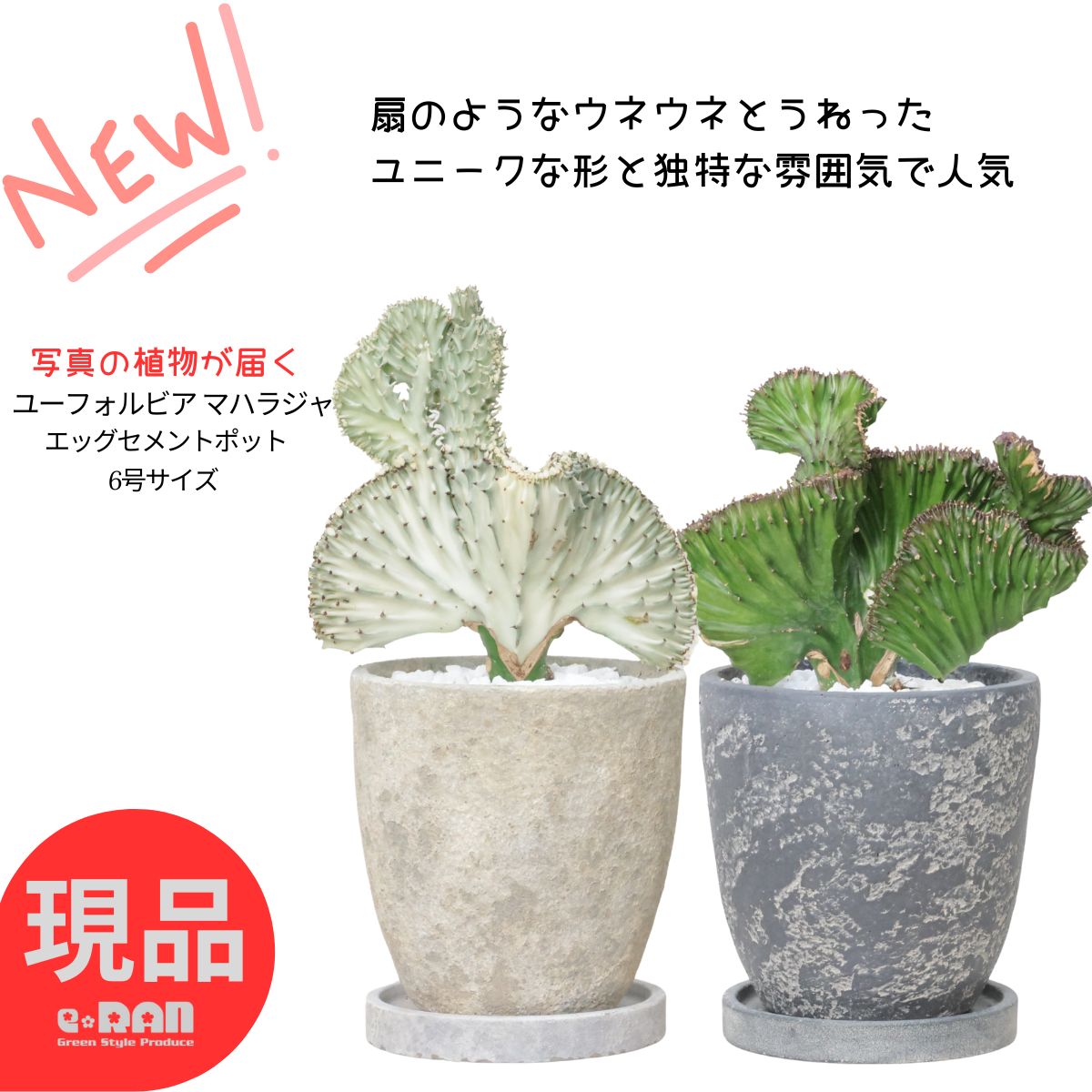 【選べる現品発送】多肉植物 ユーフォルビア マハラジャ 高さ約25〜40cm エッグセメントポット 6号サイズ 受皿付き コーラルピンク 白 緑 赤紫 ユウヤケサンゴ おすすめ 大明神 ラクテア 観葉植物 ユニークな形 扇 キリン角 ビザールプランツ