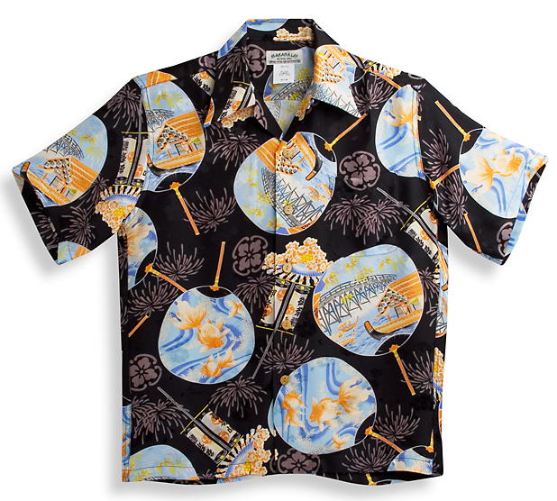 アロハシャツ|メンズ|レディース|半袖|MAKANALEI・マカナレイ|AMT062EXBK|ブラック(黒)|和柄|うちわ|金魚|屋形船柄|おしゃれ|人気|プレゼント|ギフト|誕生日|イベント|お祝|母の日|父の日|クリスマス|旅行|平織りジャガードシルク100%|開襟(オープンカラー)|送料無料