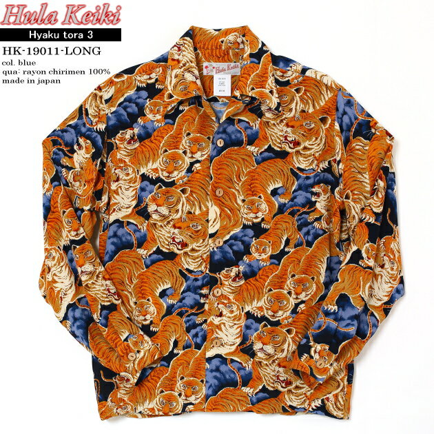 アロハシャツ|フラケイキ ハワイアン(HULA KEIKI HAWAIIAN)|マカナレイ(MAKANALEI)の姉妹ブランド|HK-19011 百虎3(HYAKU TORA)|ブルー|メンズ|レーヨン チリメン100%|開襟(オープンカラー)|フルオープン|長袖|アロハタワー(アロハシャツ販売)