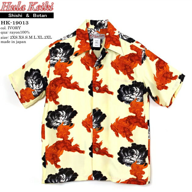 アロハシャツ|フラケイキ ハワイアン(HULA KEIKI HAWAIIAN)|マカナレイ(MAKANALEI)の姉妹ブランド|HK-19013 獅子と牡丹(SHISHI & BOTAN)|アイボリー|メンズ|レーヨン(フジエット)100%|開襟|フルオープン|半袖|アロハタワー(アロハシャツ販売)