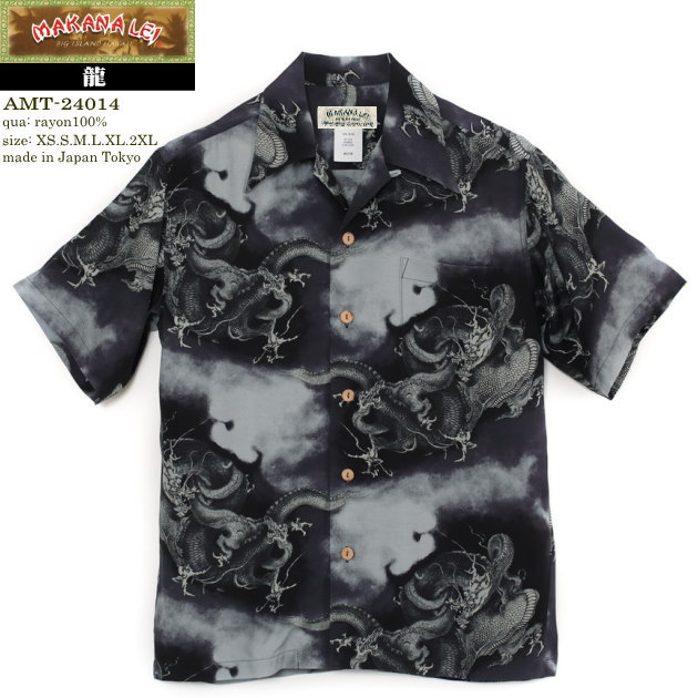 アロハシャツ|マカナレイ(MAKANALEI)|AMT-24014 龍(DRAGON)|ブラック|メンズ|レーヨン(フジエット)100%|開襟|フルオープン|2本針 巻き縫いチェーンステッチ|半袖|アロハタワー(アロハシャツ販売)