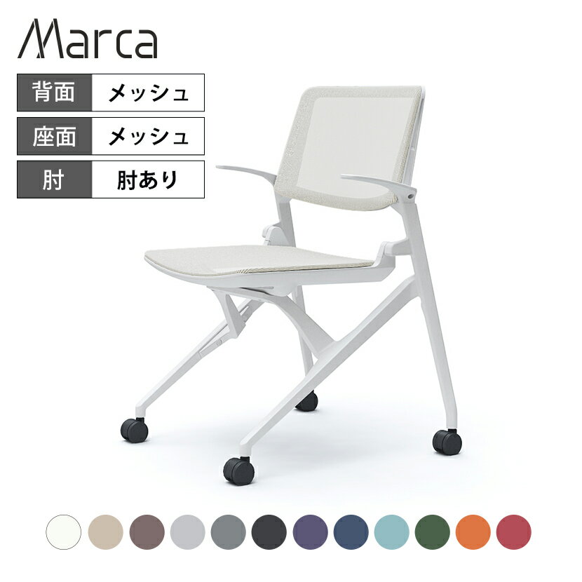 オカムラ マルカ 81M2WG カラーコード対照表F1E1(ブラック)F1E2(ホワイト)F1E3(ライトグレー)F1E4(ダークブルー)F1E6(セージ)F1E7(ベージュ)F1E8(ダークブラウン)F1E9(レッド)F1E0(パープル)F1F2(ミディアムグレー)F1F5(ダークグリーン)F1F8(オレンジレッド)ミーティングシーンに上質感とおもてなしを。 「マルカ」は、上質な空間に合うデザインと、折りたたんでコンパクトに収納できる機能性を兼ね備えた、ミーティングチェアです。座面はフレームを覆うように端までメッシュを張り、しなやかな座り心地で長時間の会議でも快適に使用できます。上質な空間に合わせやすいカラーを取りそろえ、高級感のあミーティングシーンを演出します。 ポイント 効率の良いネスティング収納 座面を跳ね上げることで、ネスティング収納が可能です。125mmピッチでコンパクトに収納できます。 ゆったりと座れるワイドメッシュ 座面幅は450mmと広く、フレームの上まで張ったメッシュがしなやかに体を受け止めます。 安全性に配慮した跳ね上げ構造 座を下した時に指をはさまないように考慮しました。また、座の回転軸が座面より上にあるので、座面後方に力を掛けても不意に座が跳ね上がることがありません。 メッシュを汚さずに使える手掛け 背の上部に手掛けが付いています。メッシュに触れることなくイスを移動することができるので、使用によるメッシュの汚れを軽減します。 使いやすいコンパクト設計 幅1800mmのサイドフォールドテーブルに3台並べて使えます。※テーブルによっては入らない場合があります。必ず事前に寸法を確認してください。 移動に便利なキャスター付き 収納する時や、場所を変えて使用する時に便利なキャスター付きです。 使用イメージ バリエーション 商品サイズ 商品について サイズ(本体)外寸 / 幅590×奥行570×高さ820mm座面高さ / 435mm 重量8.7kg 材質背・座シェル / ガラス繊維強化ポリアミド樹脂肘 / ガラス繊維強化ポリアミド樹脂脚フレーム / アルミ成型品粉体塗装キャスター / 直径50mmナイロン双輪キャスターまたは、直径50mmウレタン双輪キャスター 背メッシュ キャスターナイロンキャスターまたは、ウレタンキャスターの2種類からお選びください。※ウレタンキャスターでのご注文の場合、受注生産品となりますので、メールでの納期確定後の変更は不可となります。 生産国日本 保証について1〜3年保証(部位により保証期間が変わります)※社団法人日本オフィス家具協会(JOIFA)規定に基づく※詳しくは製品に同梱されるメーカー保証書(取扱説明書に記載)をご確認下さい。 組み立て完成品 備考・ネスティング可能・グリーン購入法適合商品 配送について ご注意この商品はメーカー直送便にてお届けします。配送時のお客様不在による持ち帰りが発生した場合、別途再配達費用を頂戴いたします。配送詳細については必ずこちらをご確認ください。 お届け日についてお届け日(発送予定)は在庫がある場合の最短納期表示です。在庫切れの場合、ご注文確定後の受注生産となり、お届けまで1カ月以上お待ちいただく場合がございます。また、配送日のご連絡につきましてご案内にお時間がかかる場合がございます。予めご了承ください。 配送費用について配送費無料。離島は別途お見積り。 階上げ(階下げ)についてAパターン※こちらの詳細をご確認ください。 引き取りサービスについて【法人様限定】 引き取りサービス ※こちらの詳細をご確認ください。※ご希望の場合は、ご注文時の備考欄にご記入ください。 備考ご希望の場合は、開梱・梱包材回収まで無料で行います。