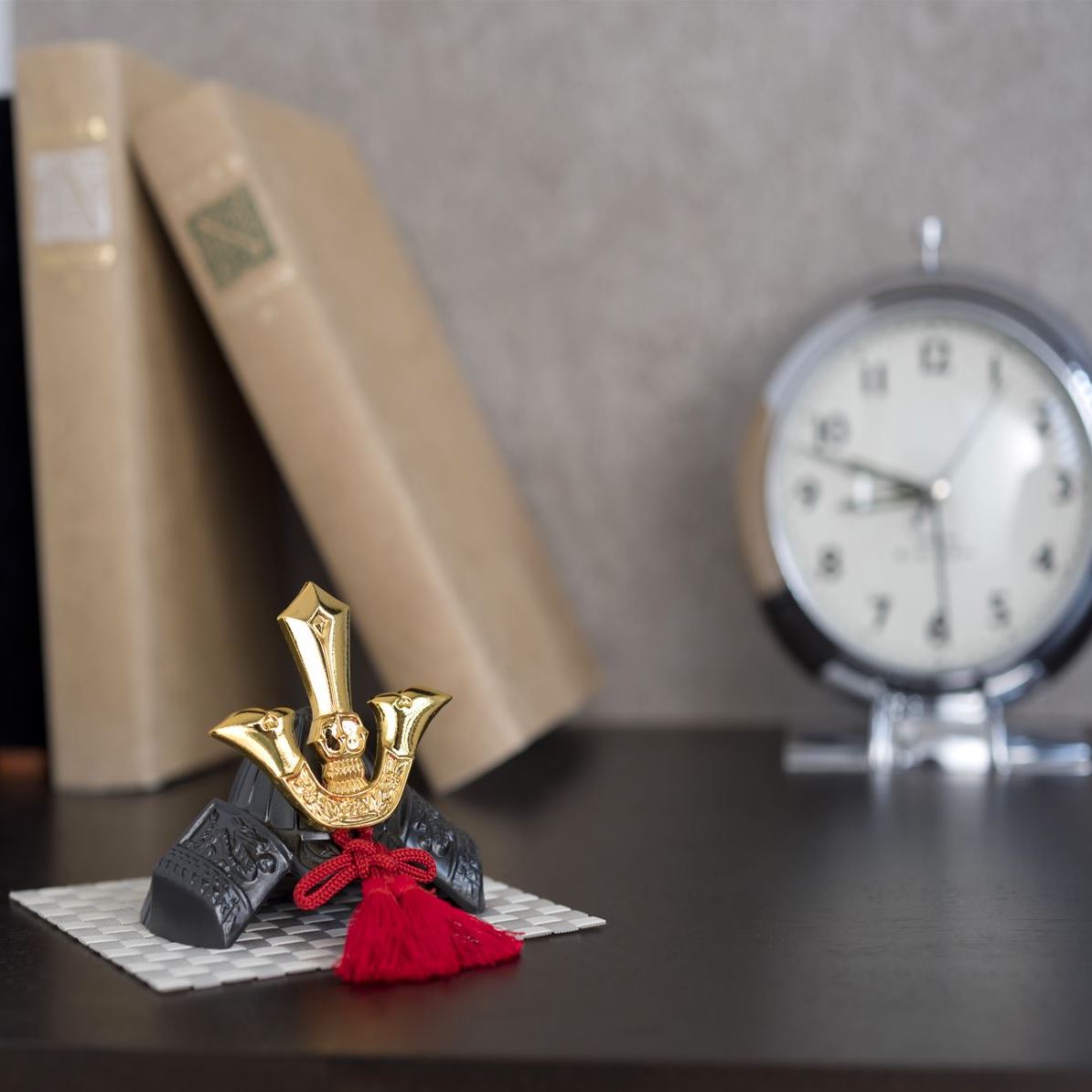 手の平サイズの小さな兜。小さなスペースやデスク周りなど、場所を選ばず飾っていただけます。小さいながらも高岡の金属技術を注ぎ込み、重圧かつ精巧な仕上がりとなっております。また鎧櫃(よろいびつ)をイメージしたパッケージは、飾り台としてもご使用頂けます。サイズ:高さ7cm 幅8cm ×奥行6.7cm 材質:亜鉛合金/金メッキ、塗装仕上