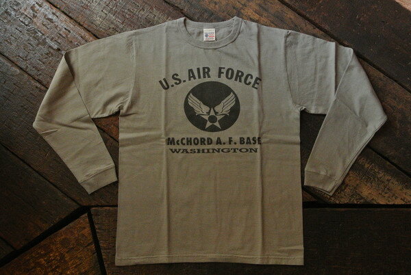 BR69626L/S T-SHIRT McCHORD A.F. BASEフロントにAIR FORCEマークとワシントン州ピアース郡にあるマッコード空軍基地の文字デザインを配したミリタリーTシャツです。バックの首下にも文字デザインがプリントされています。ボディーはMADE IN USAの柔らか目の着やすいボディー着込むことでUSAの古着のようなクタッとした風合いになっていきます。