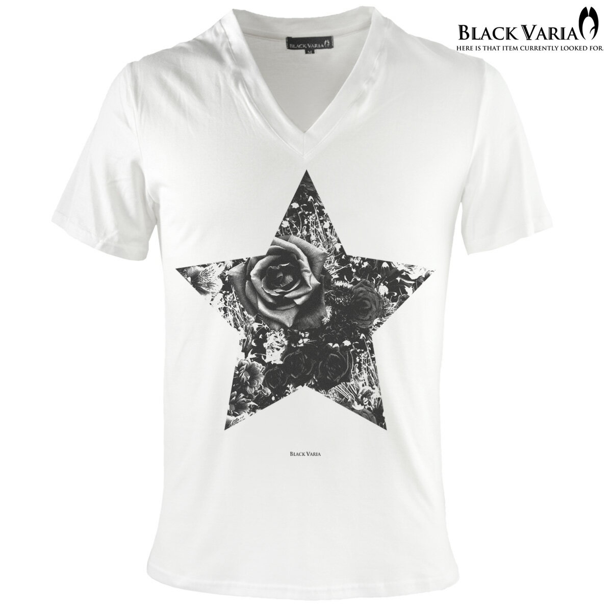 BLACK VARIA ブラックバリア blackvaria Tシャツ 星 スター バラ 薔薇柄 花柄 Vネック 半袖Tシャツ メンズ スリム 細身 mens ファッション おしゃれ (ホワイト白) zkk035