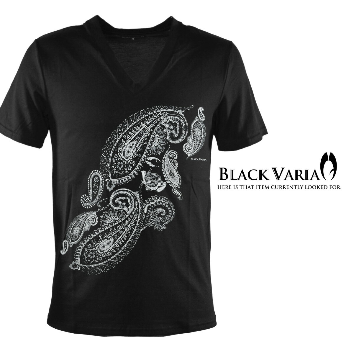 半袖 Vネック ペイズリー ペイズリー柄 プリント Tシャツ メンズ スリム 細身 mens ファッション おしゃれ (ブラック黒) zkk039
